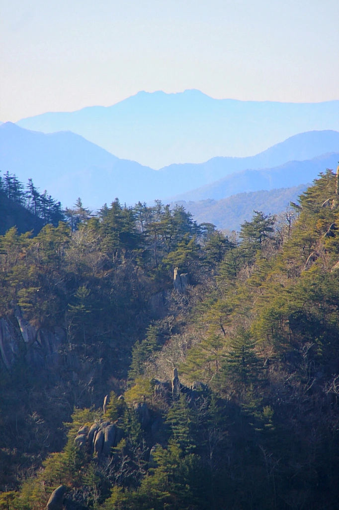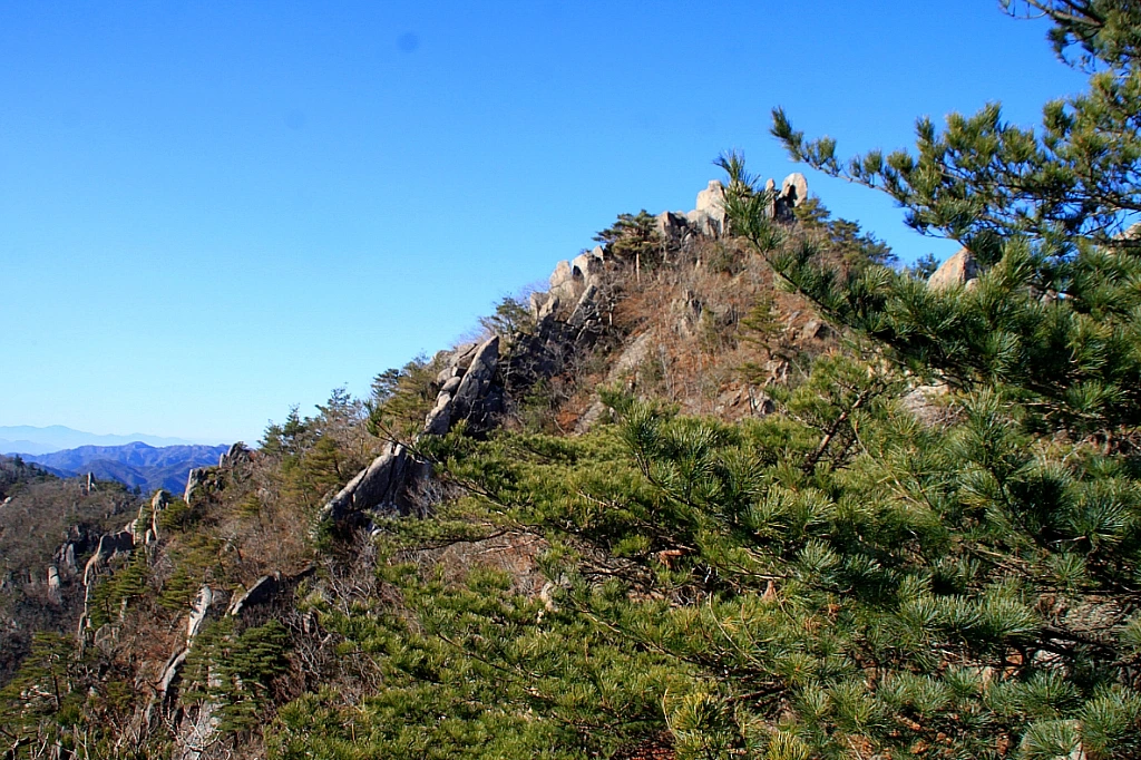 혹여 천재의 실루엣이라도 비칠까 싶어 두루두루 멀리 내다보는데 그리움릿지 능선과 그 오른쪽으로 해탈바위가 아득하게 눈에 들어온다.