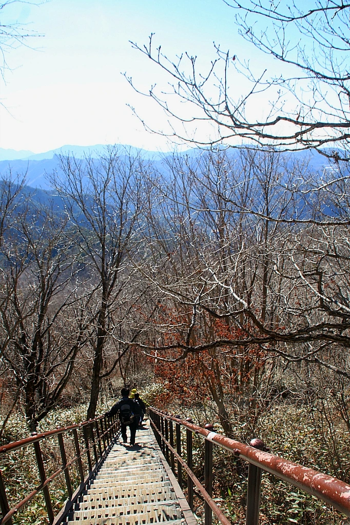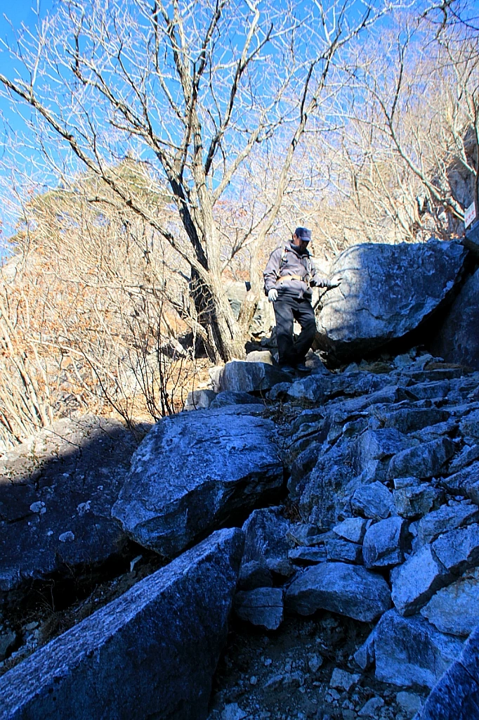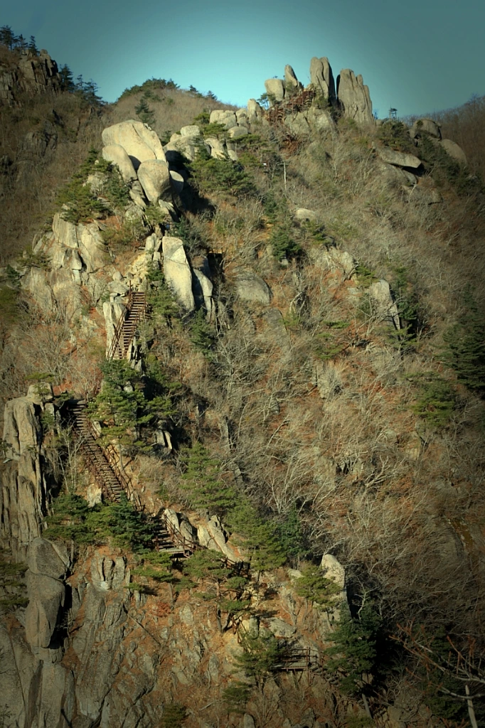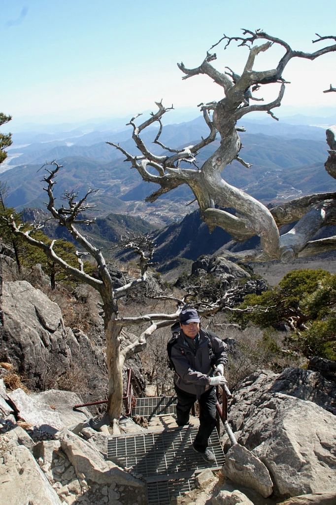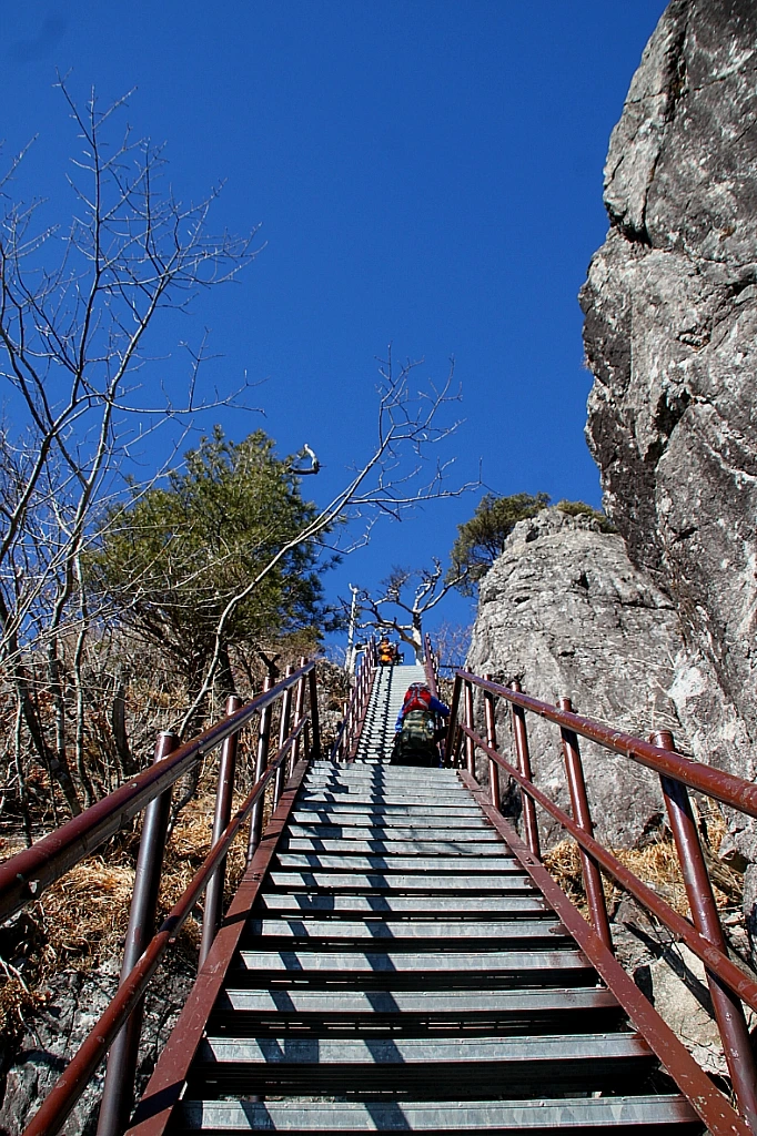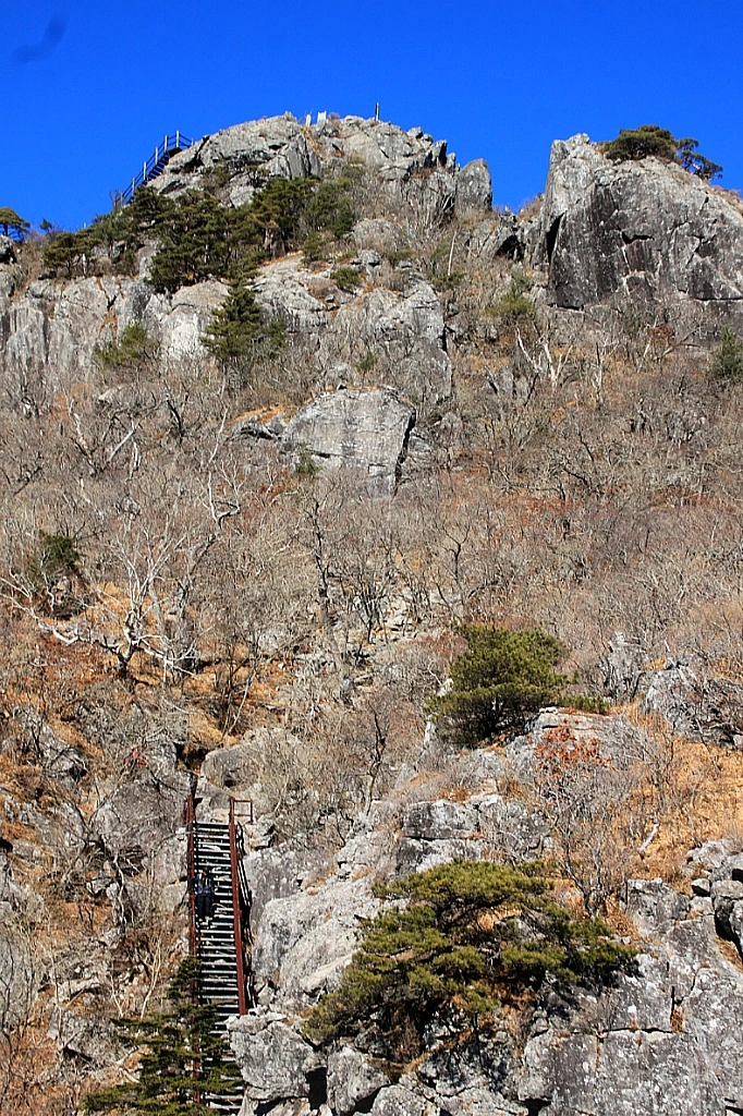 옆에서 보기에 바위 절벽 같은 칠불봉에도 계단이 놓여있다. 계단 끄트머리에는 벌거벗은 두 그루의 나무가 가지를 추켜올려 수고했다고 치하해준다.