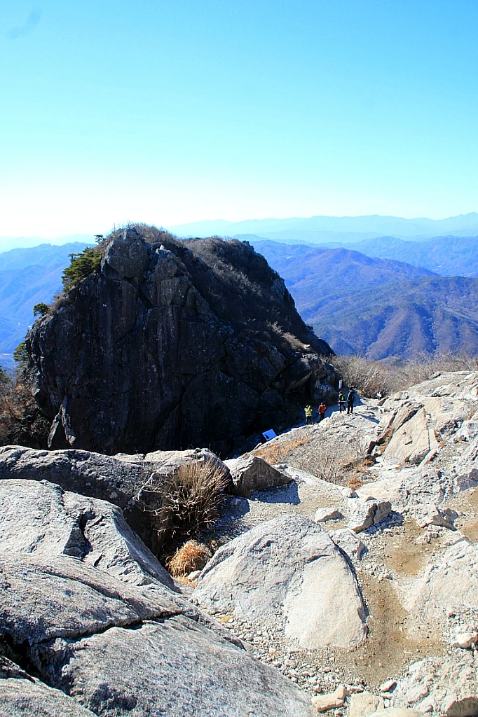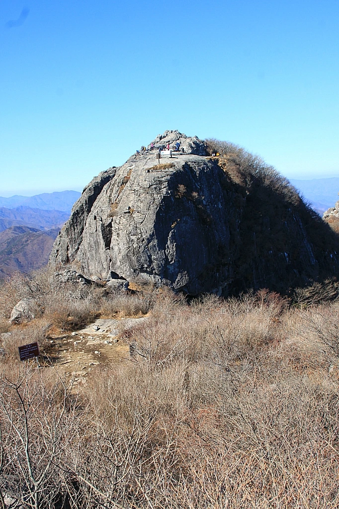 완만한 숲길이 이어지다가 경사 급한 너덜 돌길과 가파른 철제 계단을 오르며 보게 되는 경고문구들이 으스스하다. 낙뢰 주의, 미끄럼 주의, 추락 주의, 근육경련, 탈진 주의 등등. 그만큼 버겁게 올라왔음을 주지 시켜 자신을 스스로 재점검하라는 의미일 것이다.
