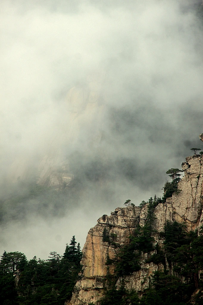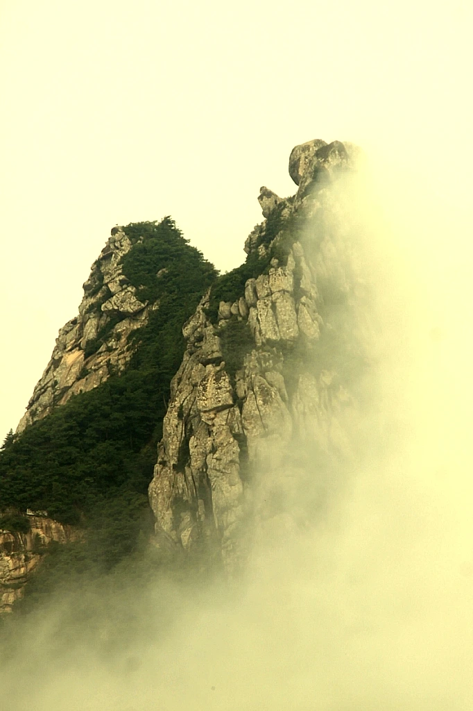 안개 걷히니 뚜렷이 나타나는 눈부신 암반