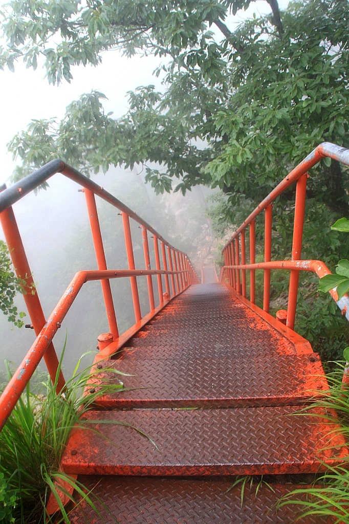 가파르지만 넓디 너른 능선, 낙차 심한 절벽을 타고 오르는 반투명 안개