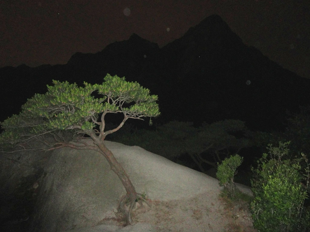 인수봉을 마주한 영봉 바위에 뿌리박은 소나무는 밤에도 여전히 푸르고 건강하다.