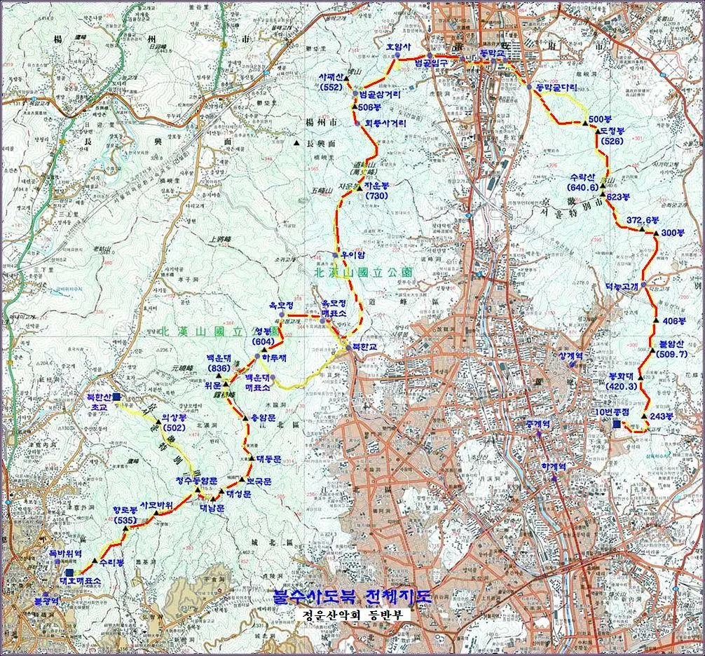 곳 / <북한산 구간> 불광역 - 대호 매표소 - 족두리봉 - 향로봉 - 비봉 - 승가봉 - 문수봉 - 대남문 - 대성문 - 보국문 - 대동문 - 용암문 - 위문 - 백운대 - 위문 - 백운산장 - 하루재 - 영봉 - 육모정 매표소 - 우이동 - <도봉산 구간> 북한교 - 원통사 - 우이암 - 도봉 주능선 - 칼바위봉 - 주봉 - 신선대 - 포대능선 - <사패산 구간> 사패능선 - 범골 삼거리 - 사패산 정상 - 범골 삼거리 - 범골 능선 - 호암사 - <수락산 구간> 동막교 - 의정부 동막골 들머리 - 500봉 - 도정봉 - 기차바위 - 주봉 - 철모바위 - 코끼리바위 - 하강바위 - 도솔봉 하단 - 동막 갈림길 - 국궁장 - 노원구 동막골 관리소 - <불암산 구간> 덕능 고개 - 폭포 약수터 갈림길 - 다람쥐광장 - 불암산 정상 - 깔딱 고개 - 봉화대 - 공릉동 갈림길 - 학도암 - 중계본동