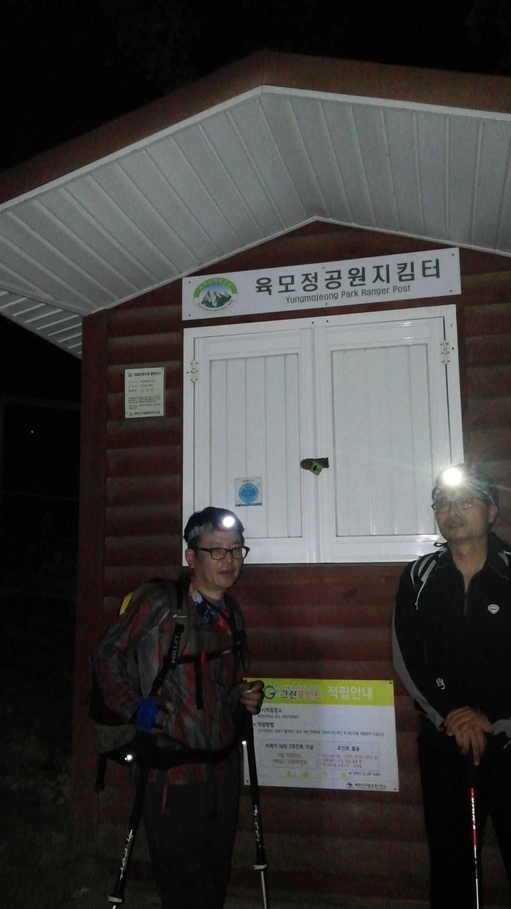영봉에서 짧지 않은 밤길을 내려와 육모정 공원 지킴터를 지나면서 다섯 산 중 가장 긴 북한산행을 무사히 마쳤다.