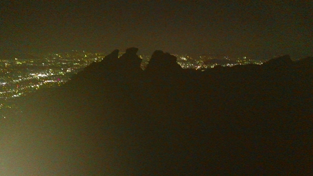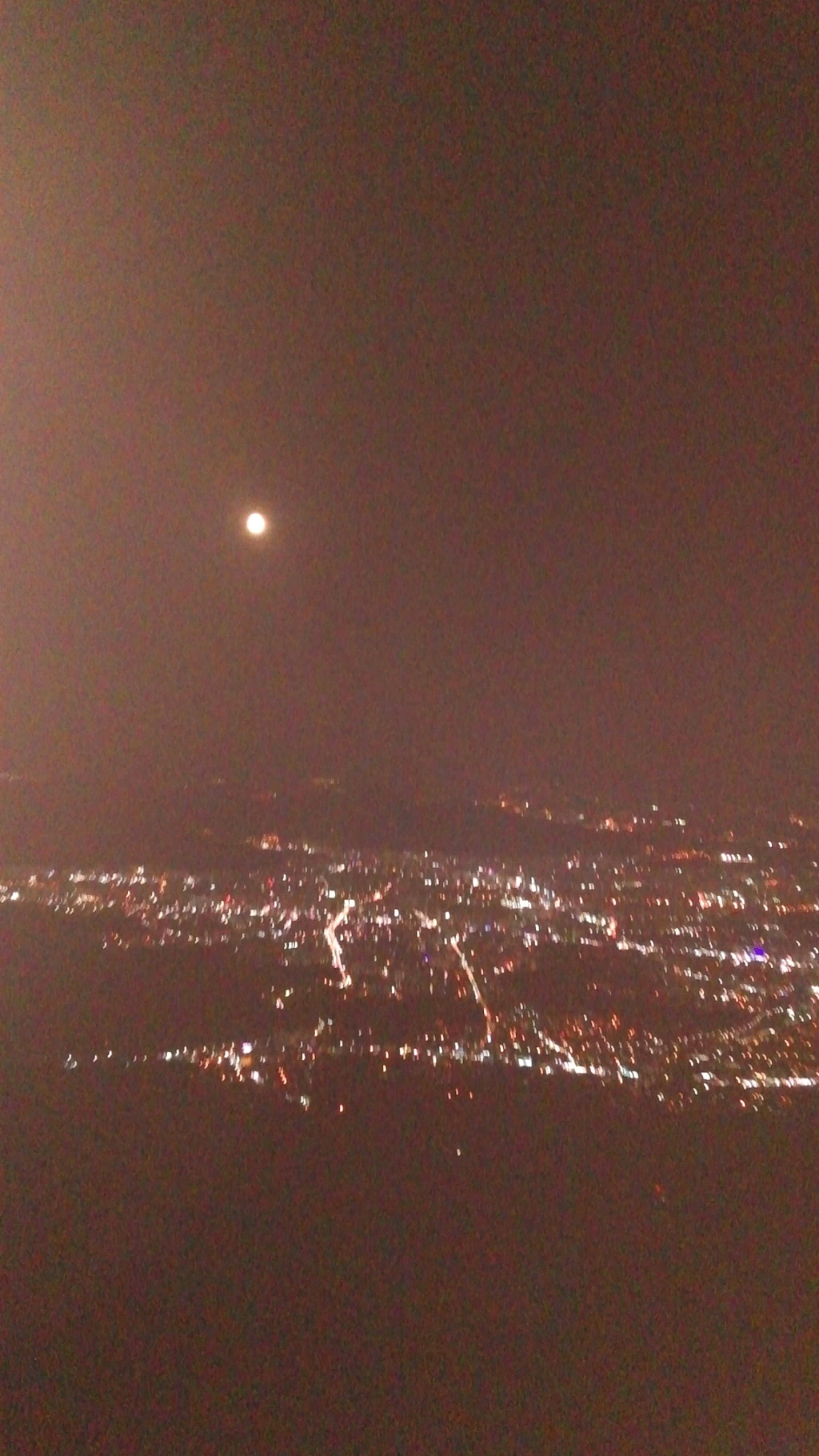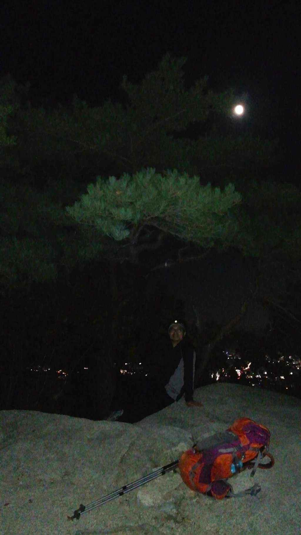 산 밑에서 뜨기 시작한 달이 꽤나 높이 올라 도심과 산길을 비춰준다.
