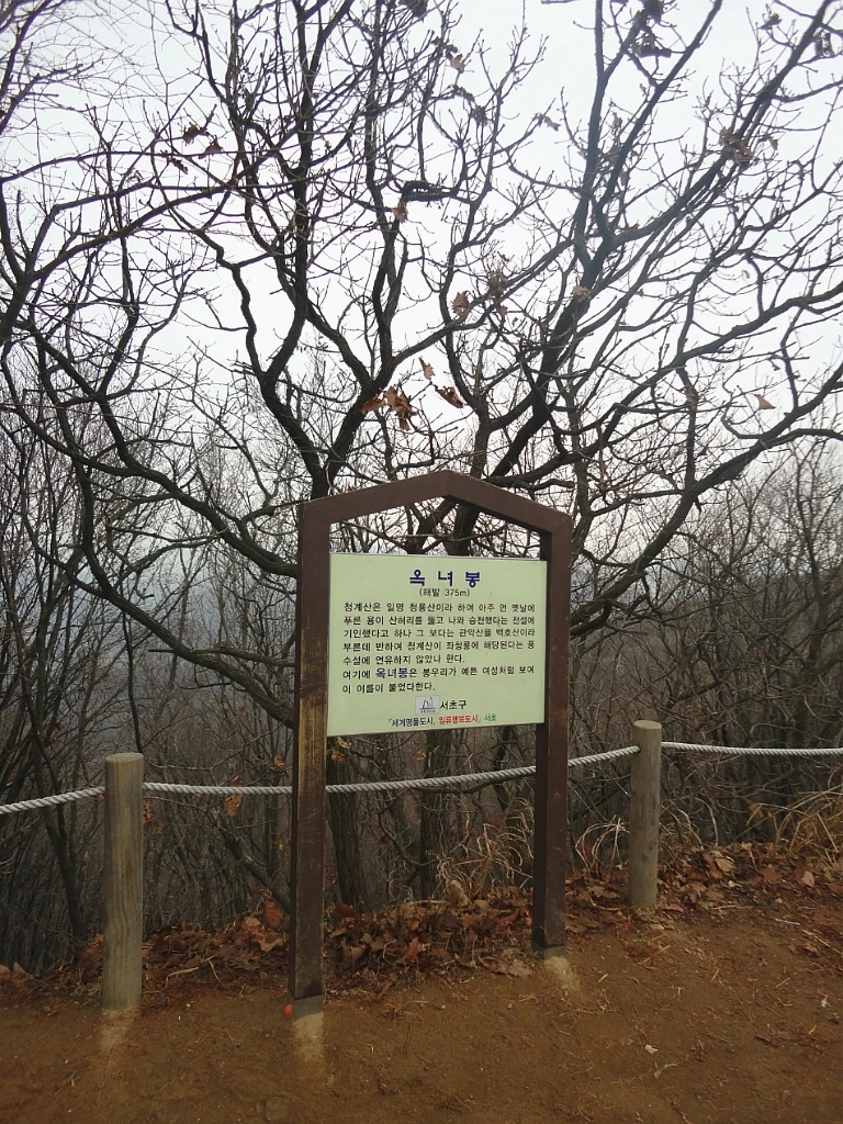 들머리에서의 첫 봉우리인 옥녀봉은 다른 산들에도 같은 이름이 많은데 여타 옥녀봉들이 설화적 유래에서 기인한 것과 달리 청계산 옥녀봉은 봉우리 모양이 예뻐서 그렇게 지었다니 비주얼하고도 명료한 이름이라 할 수 있겠다.