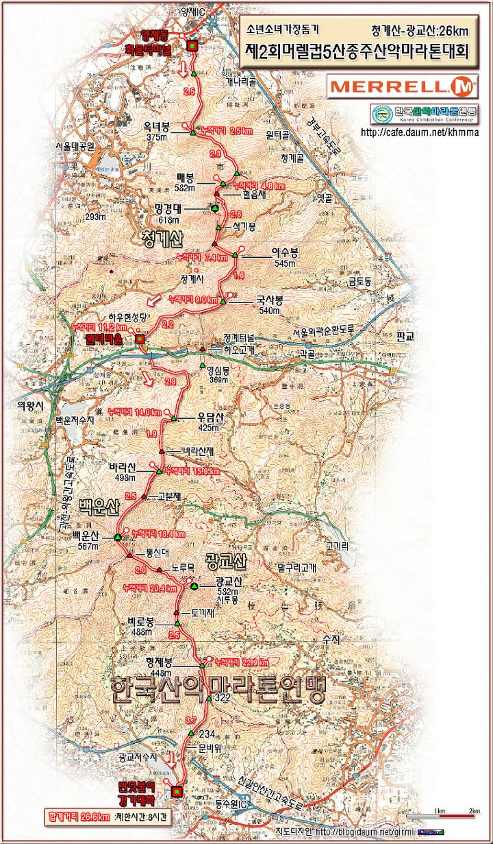 곳 / 양재동 화물터미널 - 옥녀봉 - 매바위 - 매봉 - 혈읍재 - 먕경대(청계산 정상) - 석기봉 - 이수봉 - 국사봉 - 하오고개 - 영심봉 - 우담산 정상 - 바라산재 - 바라산 정상 - 고분재 - 백운산 정상 - 통신대 - 노루목 - 시루봉(광교산 정상) - 토끼재 - 종루봉(비로봉) - 형제봉 - 문바위 - 경기대학교
