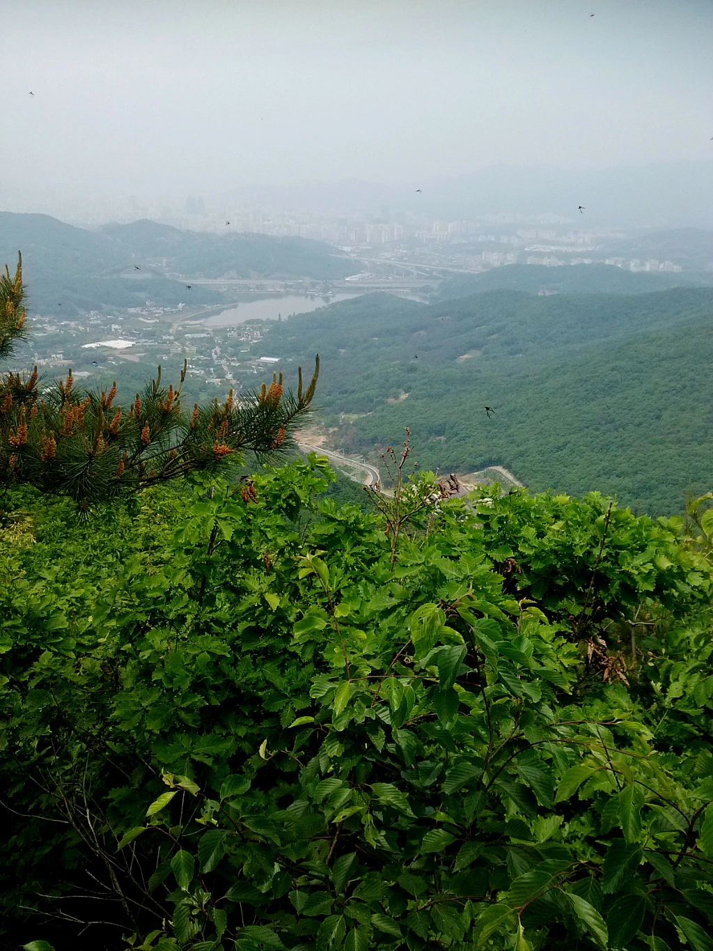 바라산(해발 498m)은 망산望山이라 불렸었는데 고려 수도 개성을 바라본다는 의미를 풀어 바라산이라 지었다고 한다. 안개가 걷히지 않아 개성은 시야에 없고 산 아래로 백운호수가 보인다. 백운호수를 시계방향으로 끼고돌면서 우담산으로 향하게 된다.