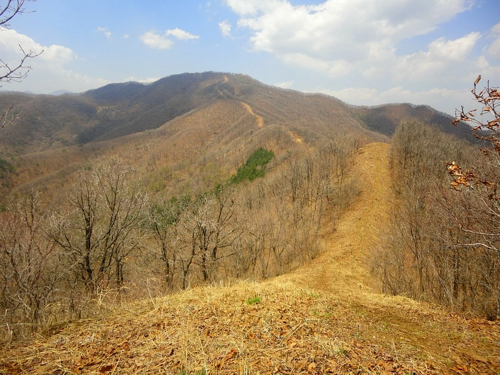 고만고만한 오르내림 후 한 시 방향으로 능선을 틀자 계관산이 보인다. 그늘이 없는 능선의 연속이다. 이젠 더위를 느낄 시간이고 땀이 솟을 만큼 걸었다. 계관산까지는 보이는 것과 달리 꽤 긴 편이다. 낮은 하늘로 뭉게구름이 흘러가고 능선 아래엔 진달래, 억새랑 잡목들이 마구 섞여 질서는 없어 보여도 수더분하고 자유스럽다. 쫓길 것도, 쫓을 것도 없는 곳, 그래서 산은 산이다.