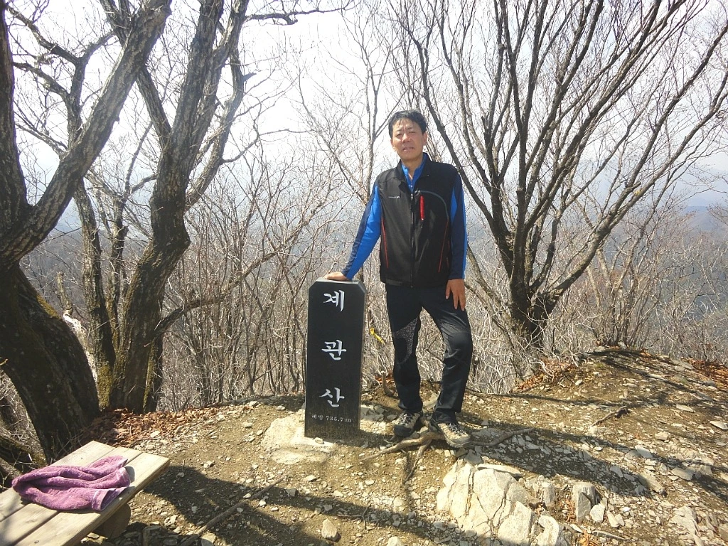 가평군 고달면 목동리 싸리재 마을로 내려가는 삼거리 고개인 싸리재를 지난다. 들짐승의 등줄기 같은 구릉 몇 개를 넘다 보니 닭 볏 형상으로 솟은 계관산鷄冠山 정상(해발 735.7m)에 이르자 몇몇 등산객들이 모여 있다.