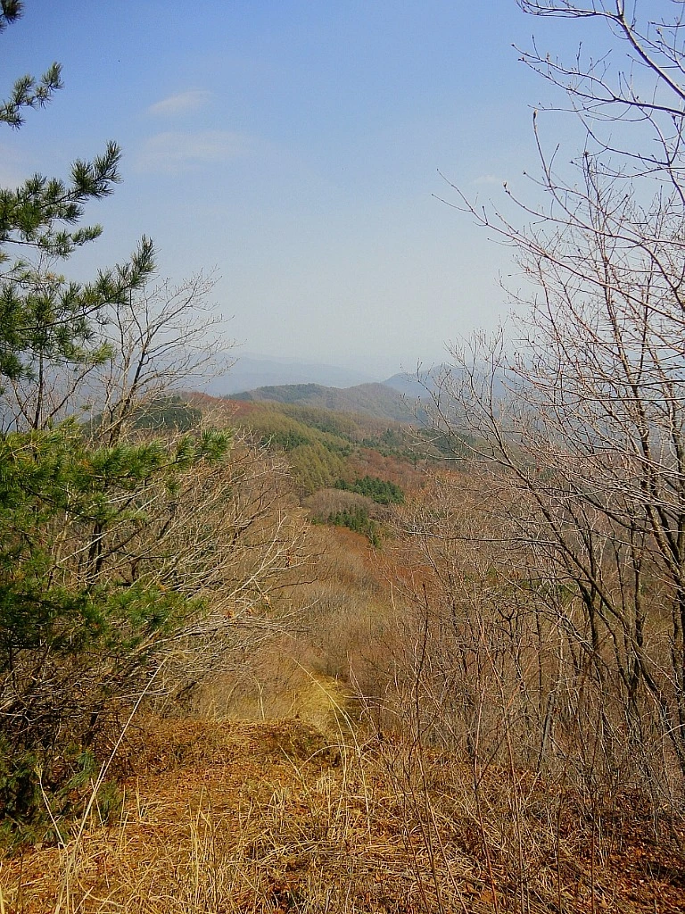 여전히 비슷한 등산로를 걸으며 오른쪽으로 명지산과 애기봉, 화악산을 보다가 납실 고개라는 갈림길에 이른다, 춘천시 서면 오월리 윗납실로 넘어가는 고개라고 한다. 간간이 새소리와 바람 소리만이 귓전을 스치고 주변에 걷는 이 한 사람 없다. 시간이 지날수록 먼 하늘이 청명해지고 있다. 여름 이후엔 키 큰 억새로 인해 걷기가 무척 불편할 듯도 느껴지지만 대체로 넓은 능선은 굴곡이 심하지 않아 겨울 산행에 적합할 것처럼 보인다.