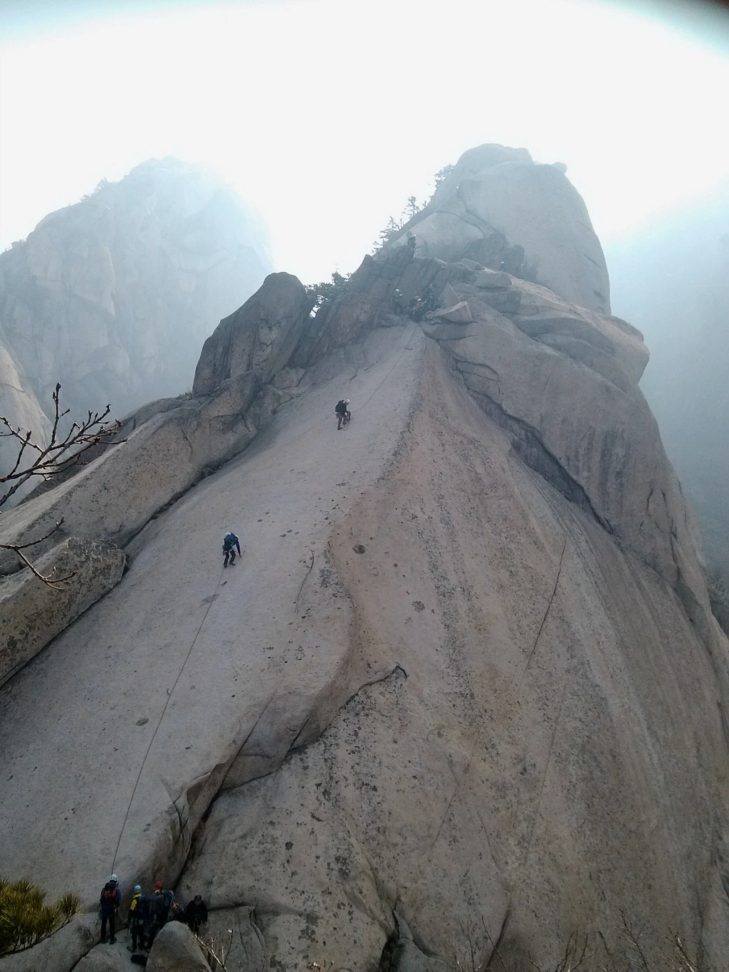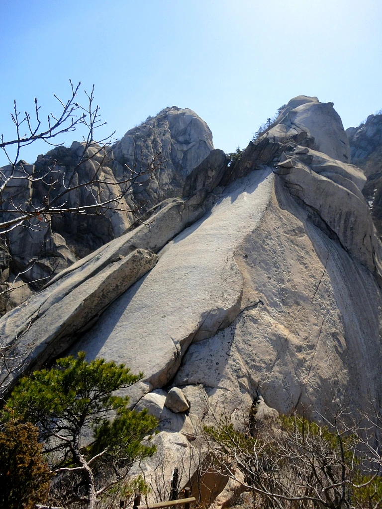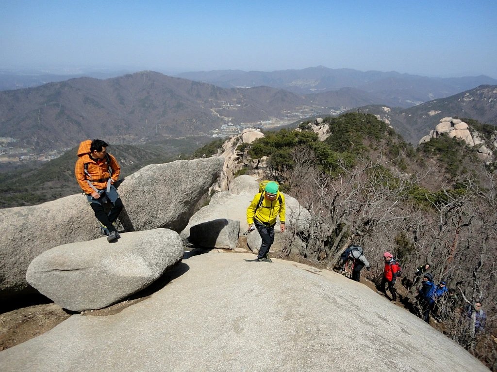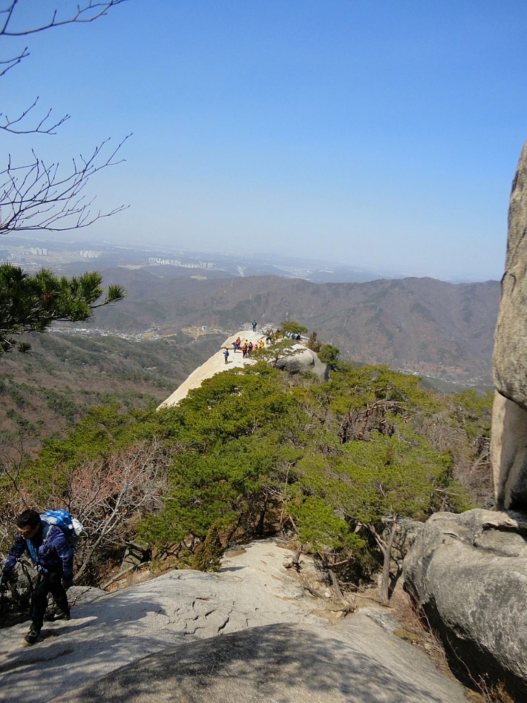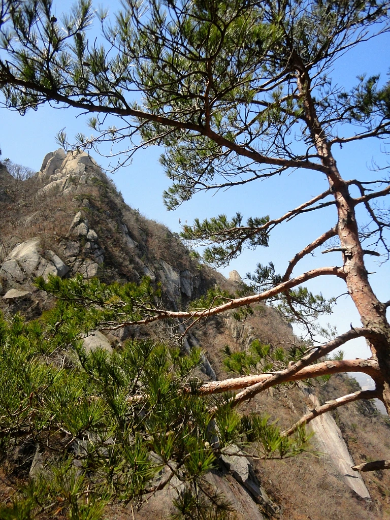 거대한 고봉高峰 틈새에서 끼고 돌아 정상頂上으로 향하는 길목능선