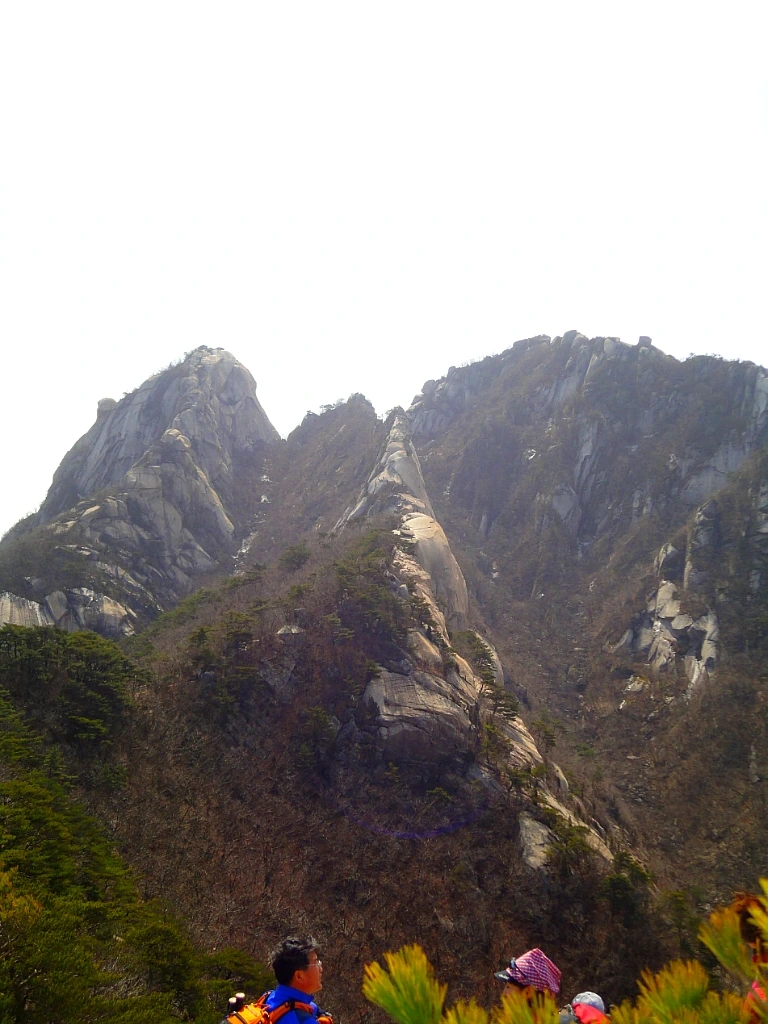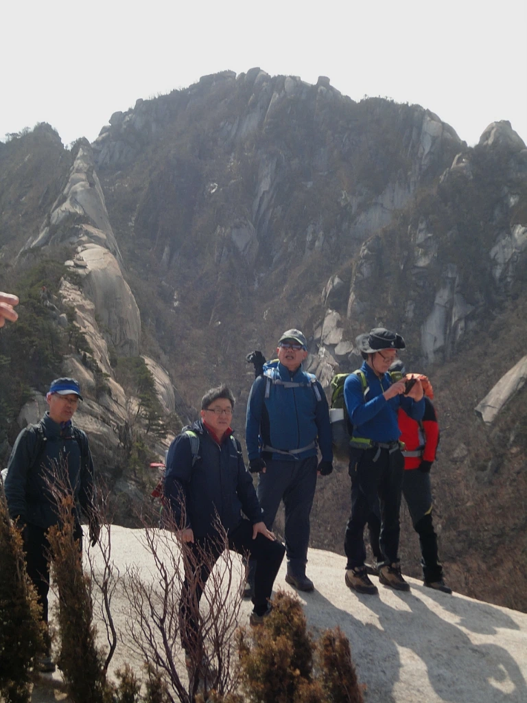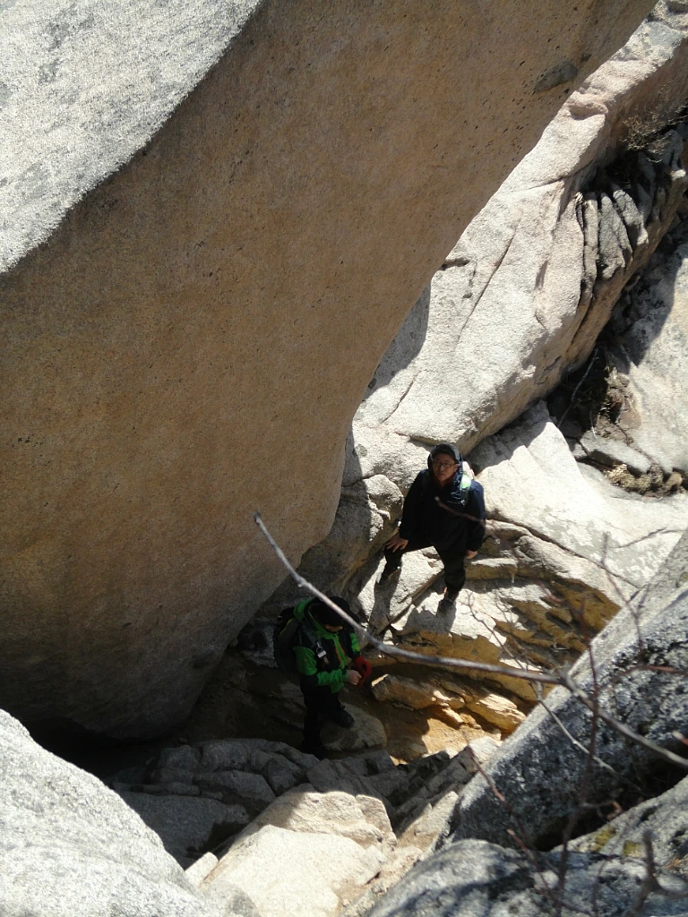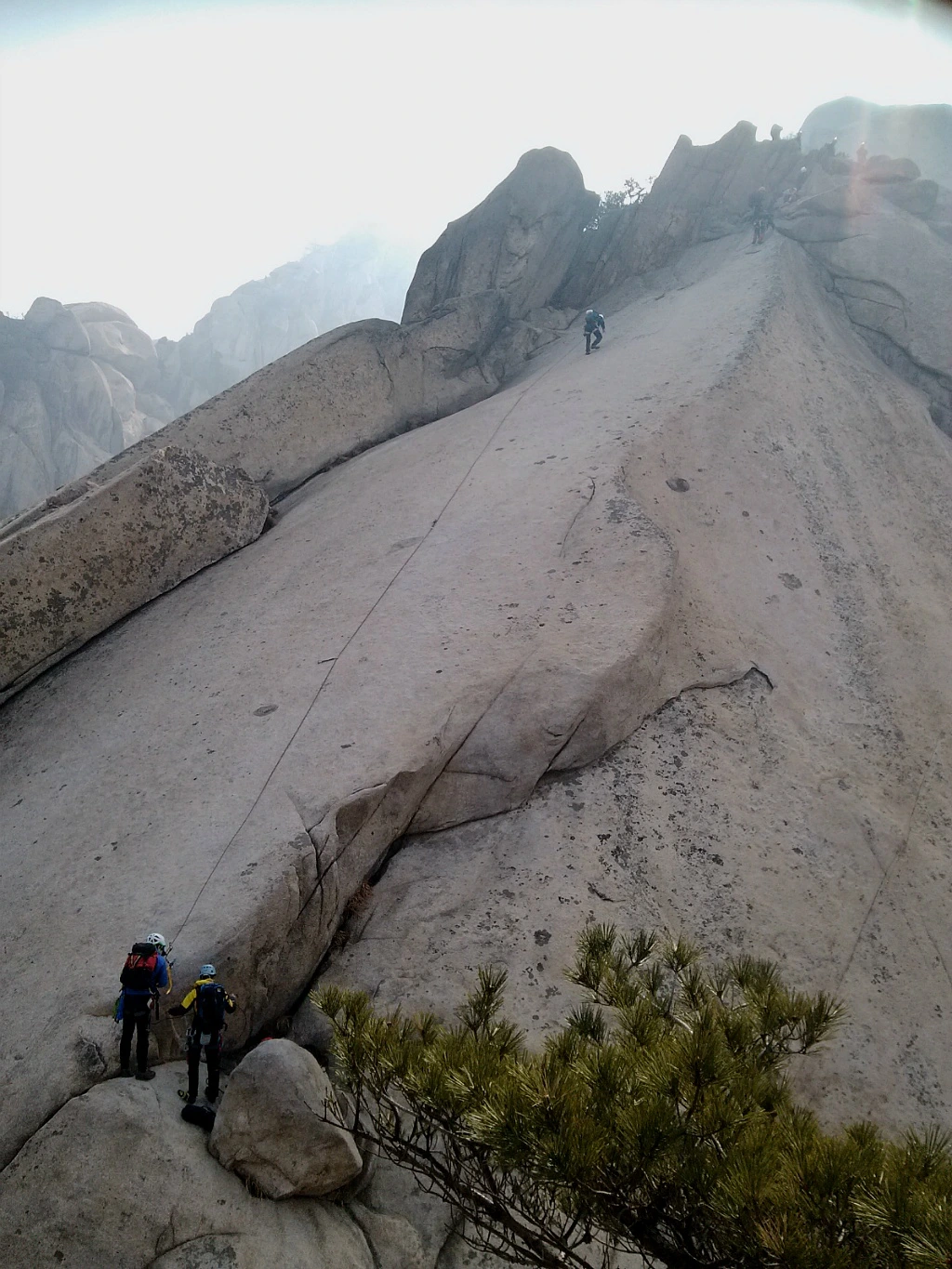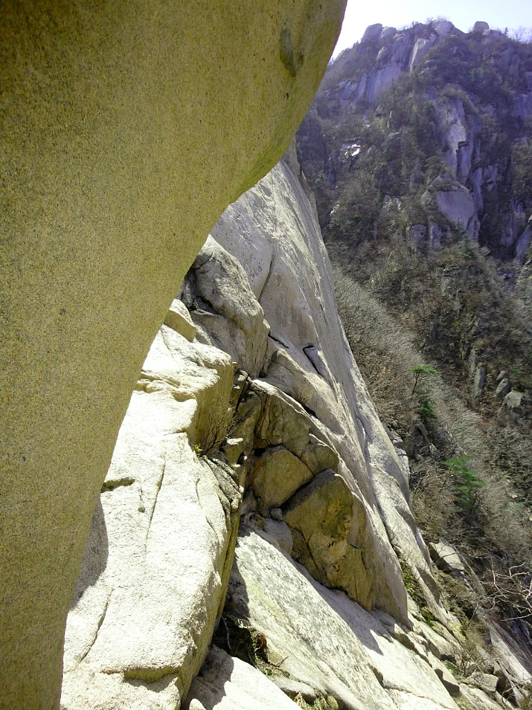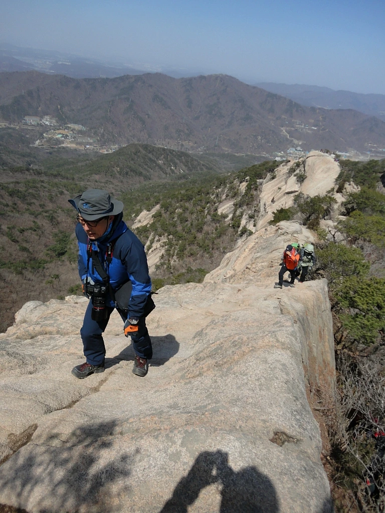 거대한 고봉高峰 틈새에서 끼고 돌아 정상頂上으로 향하는 길목능선