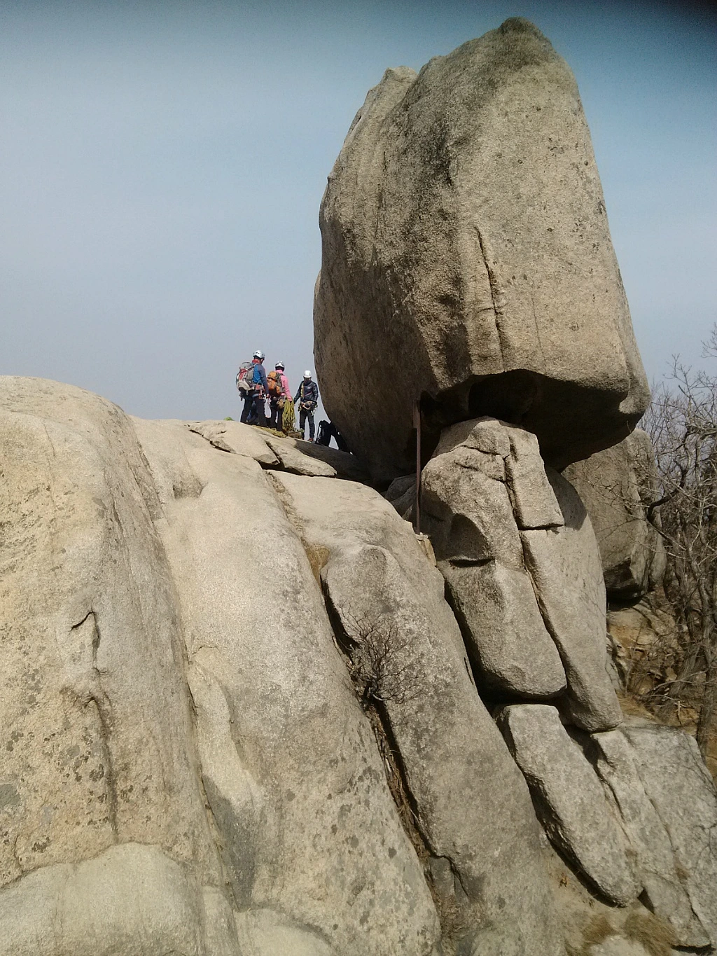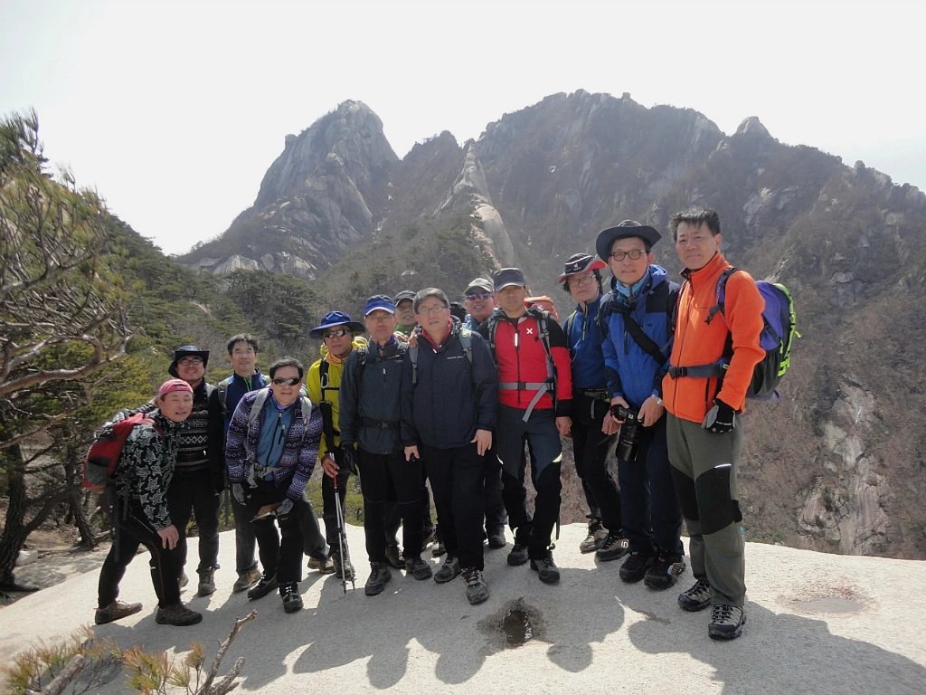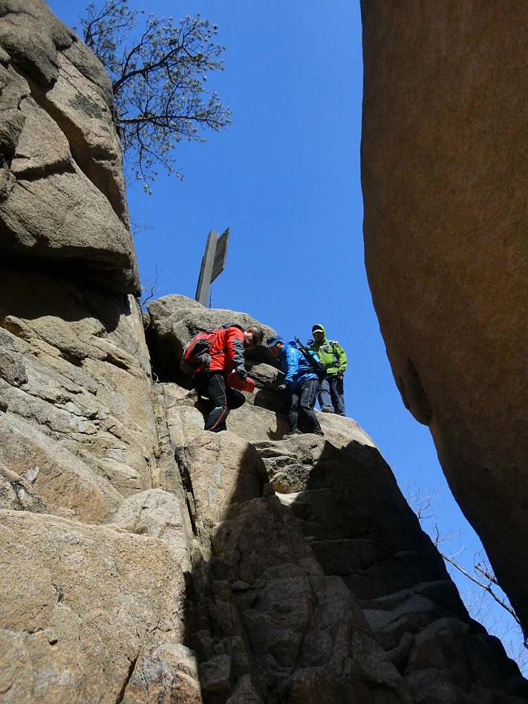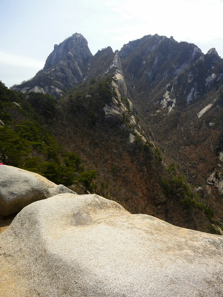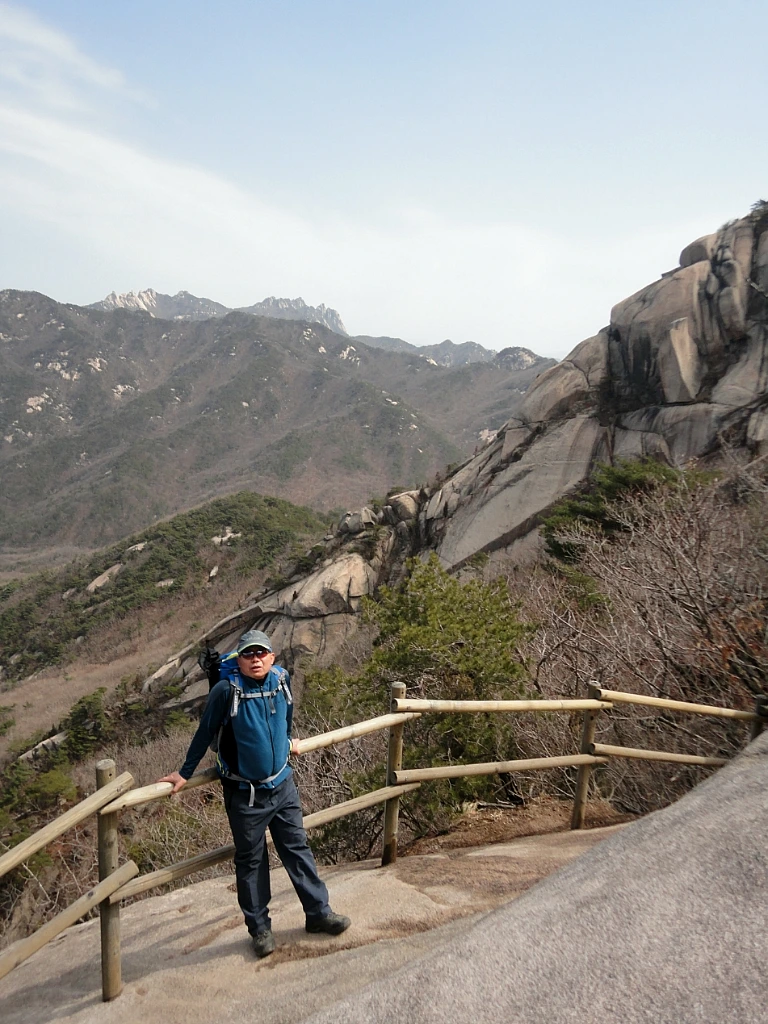 거대한 고봉高峰 틈새에서 끼고 돌아 정상頂上으로 향하는 길목능선