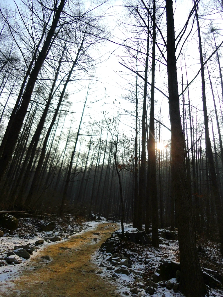 애니메이션 고등학교 뒤편 주차장 입구의 두 갈래 길에서 왼쪽으로 방향을 잡는다. 오른쪽은 현충탑 아래 노상주차장을 통해 오르는 길이다. 등산로 초입은 길도 넓고 완만하며 등산로 양옆으로 높이 뻗어 도열한 잣나무들이 하얗게 입김 뿜어내는 겨울 방문객들을 환영한다.