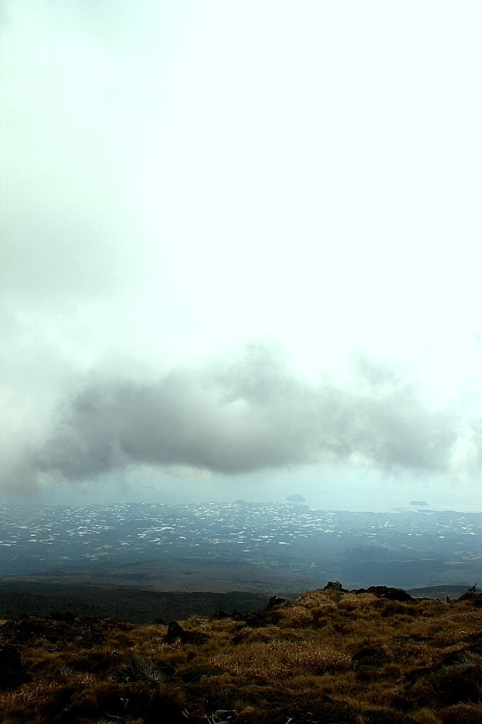 하늘에 드문드문 떠다니는 구름 사이로 제주도의 해안 전경을 내려다보고 관음사 쪽으로 하산한다. 제법 강하게 일던 바람은 내려오면서 잠잠해졌다. 삼각봉 대피소에 이르러 숨을 돌렸다가 식사를 한다.