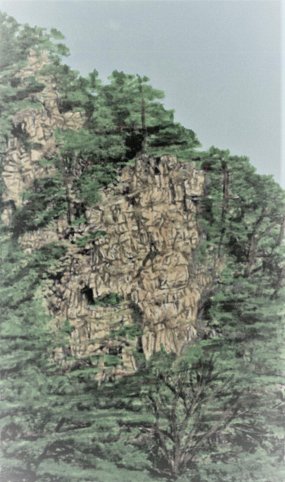 다듬어지지 않은 등산로는 급경사의 연속이다. 다소 버겁게 주능선 절벽 밑에 올라서서 거푸 절벽 아랫길을 걷게 된다. 무척 거친 바위 능선길이다. 아래 솔고개에서 보았던 솔나무 뒤로 병풍처럼 둘러친 단풍산 정상 일대. 그 절벽 군 아래를 걷는 중일 것이다.