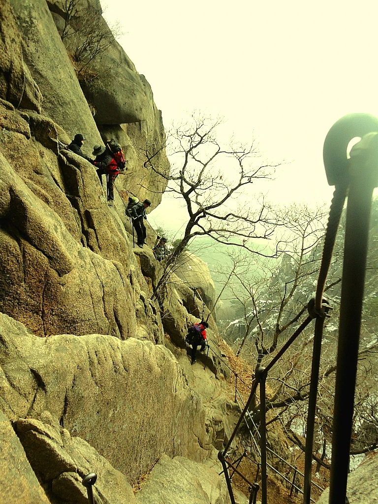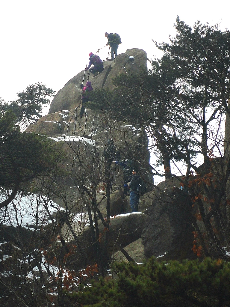 역시 산은 누구에게나 가장 공평한 곳이라는 진리를 되새기기도 한다. 산 좋아 산 찾는 이들, 그네들 스스로 어디 남녀노소 따져가며 길 택하던가. 다소 가파른 오르막이면 쇠줄 꼭 잡아 몸 의지하고, 내리막 무너미고개 미끄러우면 보폭 줄여 발 내디디면 되지. 산만큼 차별 없는 곳이 세상천지 어디 또 있던가.