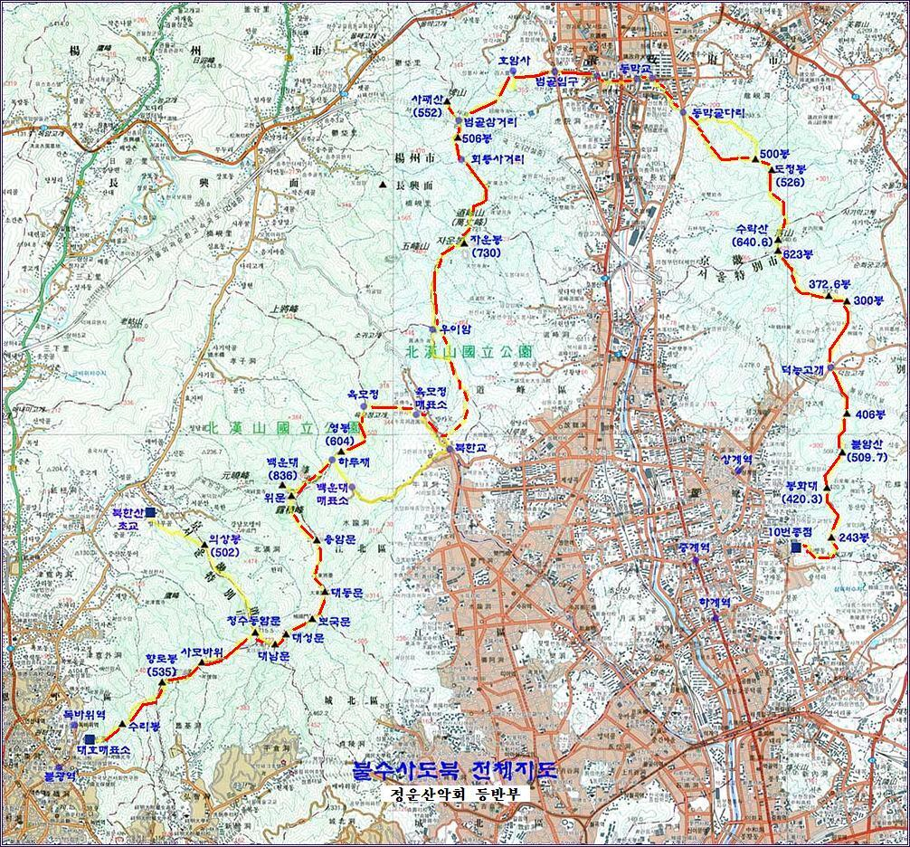 곳 / <불암산 구간> 1142번 종점 - 중계 복지회관 - 청록 약수터 - 학도암 - 봉화대 - 두꺼비바위 - 불암산 정상 - 폭포 약수터 갈림길 - 덕능 고개 - <수락산 구간> 송신탑 - 도솔봉 – 치마바위 - 철모바위 – 수락산 주봉 – 도정봉 – 동막골 - <사패산 구간> 범골 탐방지원센터 - 회룡사 - 회룡골 계곡 - 회룡골 삼거리 - 사패능선 - 사패산 정상 - 사패능선 - 산불감시초소 - <도봉산 구간> 포대능선 - Y계곡 우회로 – 신선대 - 우이암 - 원통사 - 우이동 - 우이동 탐방지원센터 - <북한산 구간> 육모정 통제소 - 육모정고개 – 영봉 – 하루재 - 백운봉암문 - 백운대 - 대동문 - 대남문 - 비봉능선 - 승가봉 - 사모바위 - 비봉 - 향로봉 - 족두리봉 - 불광동 탐방지원센터