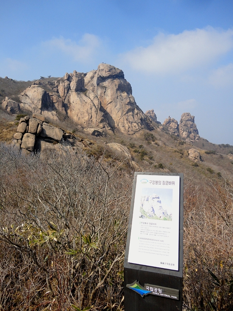 무수한 격전을 치른 노련한 장군의 형상, 구정봉을 머리에 얹은 장군바위가 많은 기암 중에서도 유독 튀는 모습이다.