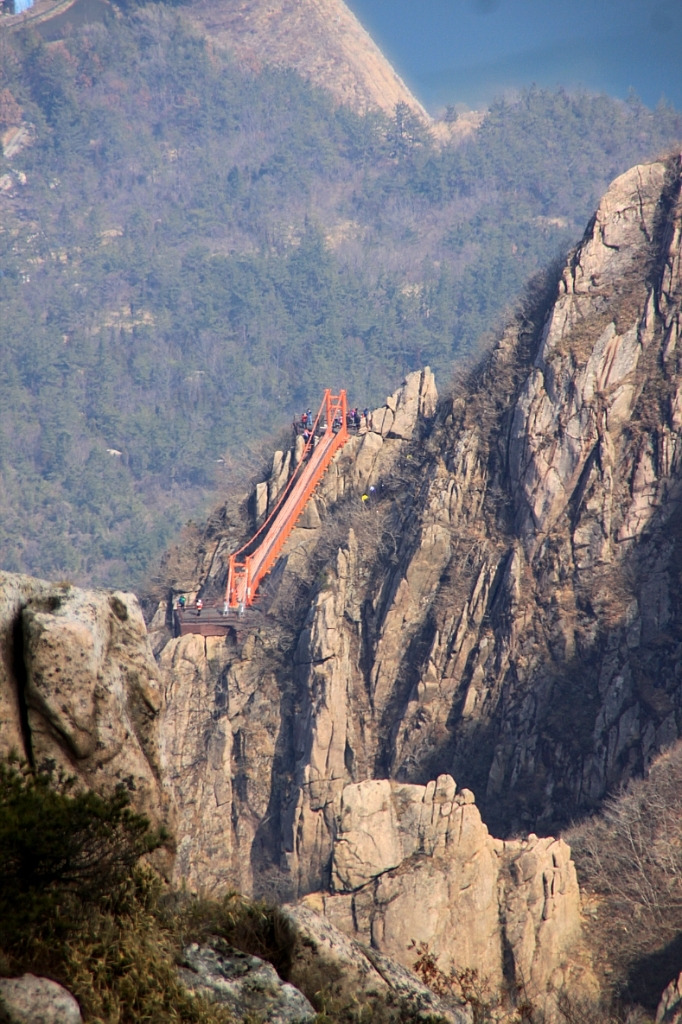 바위 사이 봄 오는 길과 함께 회백색 봉우리들 사이로 빨간 구름다리가 보인다. 서너 시간 걸리던 매봉과 사자봉을 5분 거리도 채 안 되게 단축한 이 다리는 해발 510m, 지상 높이 120m에 길이 54m로 200명이 동시에 이용할 수 있다.