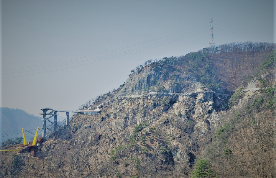 간현교 너머 산 중턱에 완공한 스카이타워와 울렁 다리