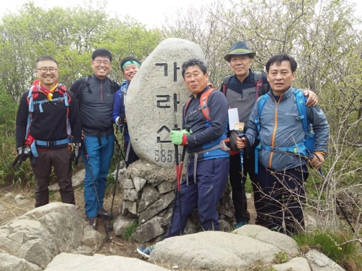 농을 주고받으면서도 친구의 체력을 염려해준다. 모두가 다 같이 안전하게 완주하고픈 마음이 동하기 때문이다. 진행할 능선을 따라 볼록하게 솟아 앞이마가 벗어진 봉우리가 가라산 정상이다.