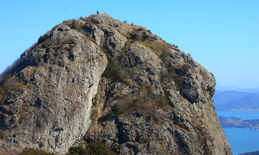 거친 암벽의 심봉 정상(해발 598m)을 설치된 밧줄 잡고 올라서자 오른편으로 주봉인 상왕봉이 솟아있고 언덕 너머로 완주 대둔산이 보인다. 아직 해무가 채 걷히지 않았지만 너른 해상공원은 이 지역의 경관을 완성하는 화룡점정이라 할 수 있겠다.