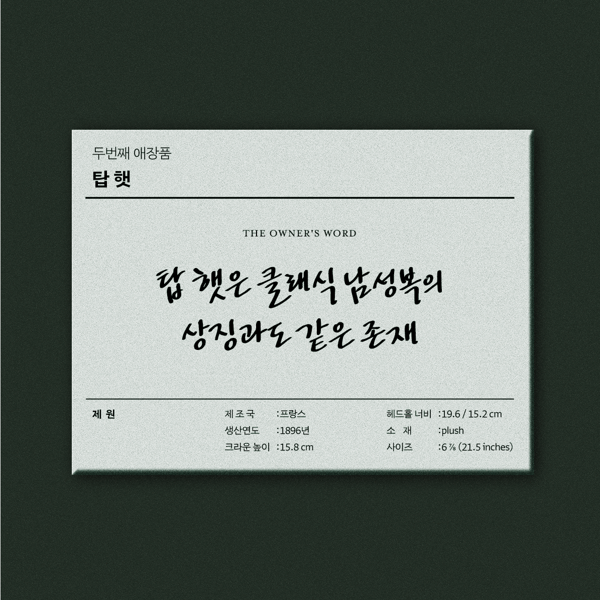 이 탑햇을 손에 넣은 것은 18살, 그러니까 11년 전이다. 당시 나는 고등학교 2학년으로 양복을 막 입기 시작하며 이 시대의 양복에 대해 막 공부하기 시작한 참이었다.