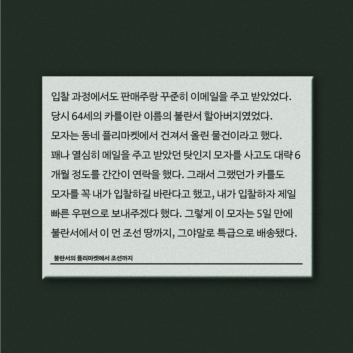 입찰 과정에서도 판매주랑 꾸준히 이메일을 주고받았다. 당시 64세의 카를(?)이란 이름의 불란서 할아버지였다. 모자는 동네 플리마켓에서 건져서 올린 물건이라고 했다. 꽤나 열심히 메일을 주고받았던 탓인지 모자를 사고도 대략 6개월 정도를 간간이 연락을 했다. 그래서 그랬던가 카를도 모자를 꼭 내가 입찰하길 바란다고 했었고, 내가 입찰하자 제일 빠른우편으로 보내주겠다고 했다. 그렇게 이 모자는 5일 만에 불란서에서 이 먼 조선 땅까지, 그야말로 특급으로 배송되었다.