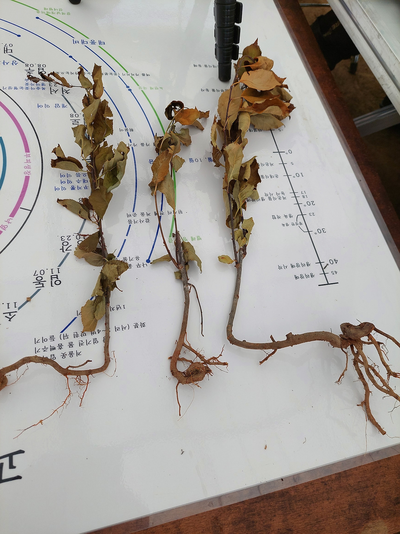 오른쪽 사진은 수업 중에 장영란 선생님이 보여준 묘목입니다. 뿌리가 땅속에서 잘 퍼져 자라지 못하고 뭉치거나 한 방향으로 뒤틀린 경우입니다. 묘목을 심을 때 구덩이를 넓게 파지 않거나 땅 속 상태가 너무 조밀해 뿌리가 잘 성장하지 못하면 이런 모습으로 자란다고 합니다. 나무가 이렇게 살아간다면 아무래도 이래저래 문제가 많겠지요. 이것을 보면 나무뿌리가 의외로 힘이 약하다는 것을 알 수 있습니다. 묘목을 심을 때는 이 점을 잘 기억해 두어야겠습니다.