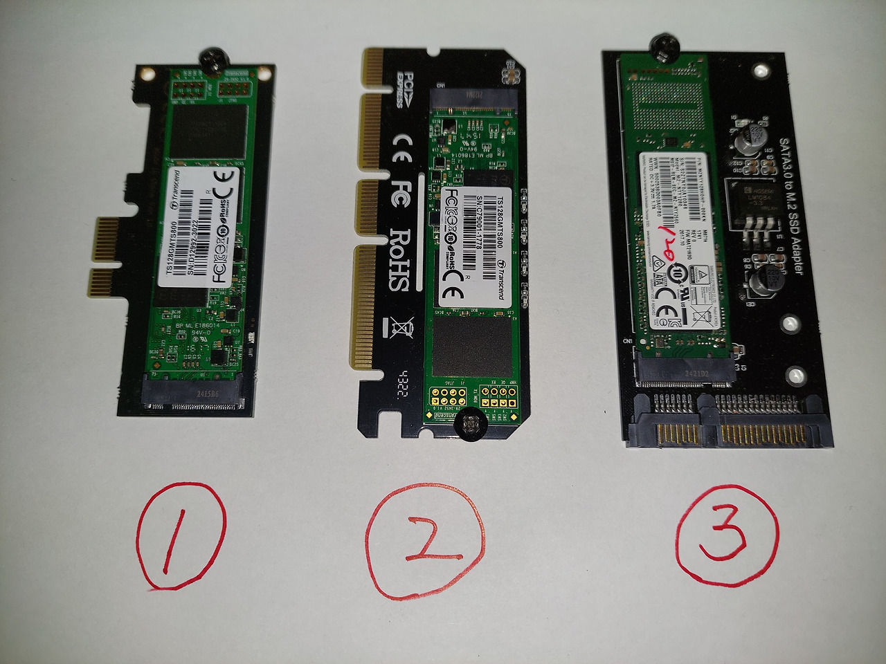 먼저 사진의 ①처럼, 128기가 M.2를 PCIe 컨버터에 끼워서 PCIe x1 레인에 삽입했습니다. 인식을 못합니다. 이번에는 ②와 같이 M.2를 PCIe 컨버터에 끼워서 PCIe x16레인에 끼워봤습니다. 역시 인식 불가입니다. 마지막으로 M.2를 ③과 같이 M.2 TO SATA 컨버터에 끼워서 SATA 케이블에 연결해 봤습니다. 다행히 이번 시도는 성공했습니다. 속도를 보면 ②가 가장 빠르고, 그다음이 ①, 가장 느린 것이 ③ 번인데 그래도 하드 디스크보다는 빠르니 이 정도에서 만족해야겠습니다.