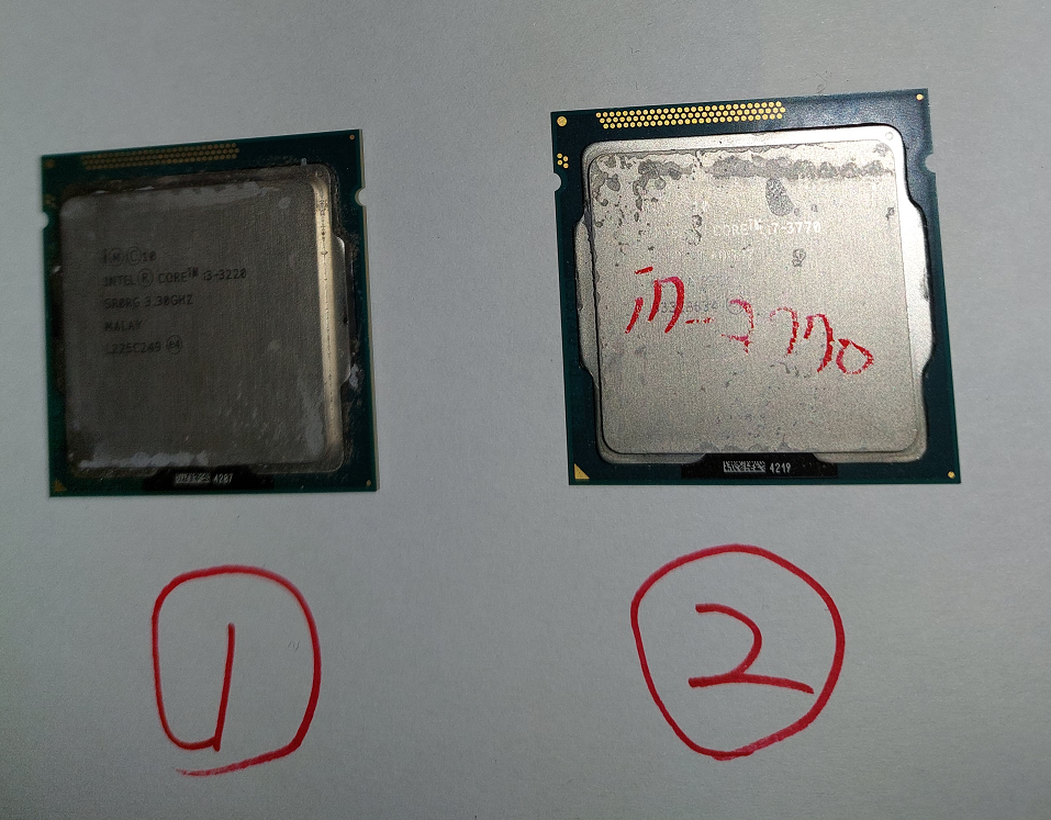 현재 CPU는 인텔 코어 i3-3세대인 3220이 장착되어 있습니다.(왼쪽 사진의 ①) 소켓(1155)이 같은 i7-3770(아이비브릿지) 중고를 5만 원에 구입하여 교체했습니다.(사진의 ②, 2024.10.3일 구입) 현재 중고 거래 사이트를 보면 i3-3220은 3,000원, i7-3770은 4만 원 정도 합니다.