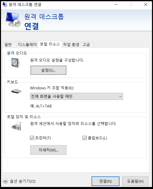 <로컬 장치 및 리소스> 항목 체크를 확인합니다. 로컬 장치란 클라이언트 컴퓨터를 말합니다. 리소스란 자원 혹은 자료를 뜻합니다. 원격 세션이란 클라이언트 컴퓨터에 보이는 서버 컴퓨터의 바탕화면 혹은 서버 컴퓨터 그 자체를 지칭합니다.