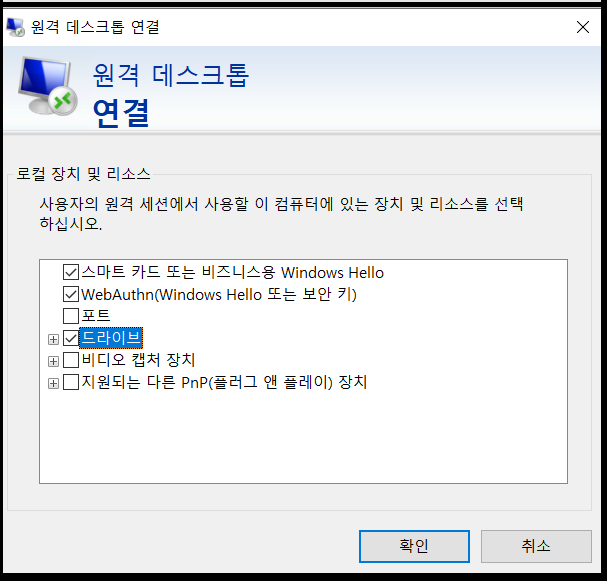 '드라이브'를 체크하면 원격 세션, 즉 서버 컴퓨터에 클라이언트 컴퓨터의 드라이브가 모두 가상 드라이브로 등록됩니다. 그 옆의 + 마크를 클릭해 보면 클라이언트 컴퓨터의 모든 폴더와 '나중에 연결할 드라이브'까지 체크 표시가 되어있음을 확인할 수 있습니다.