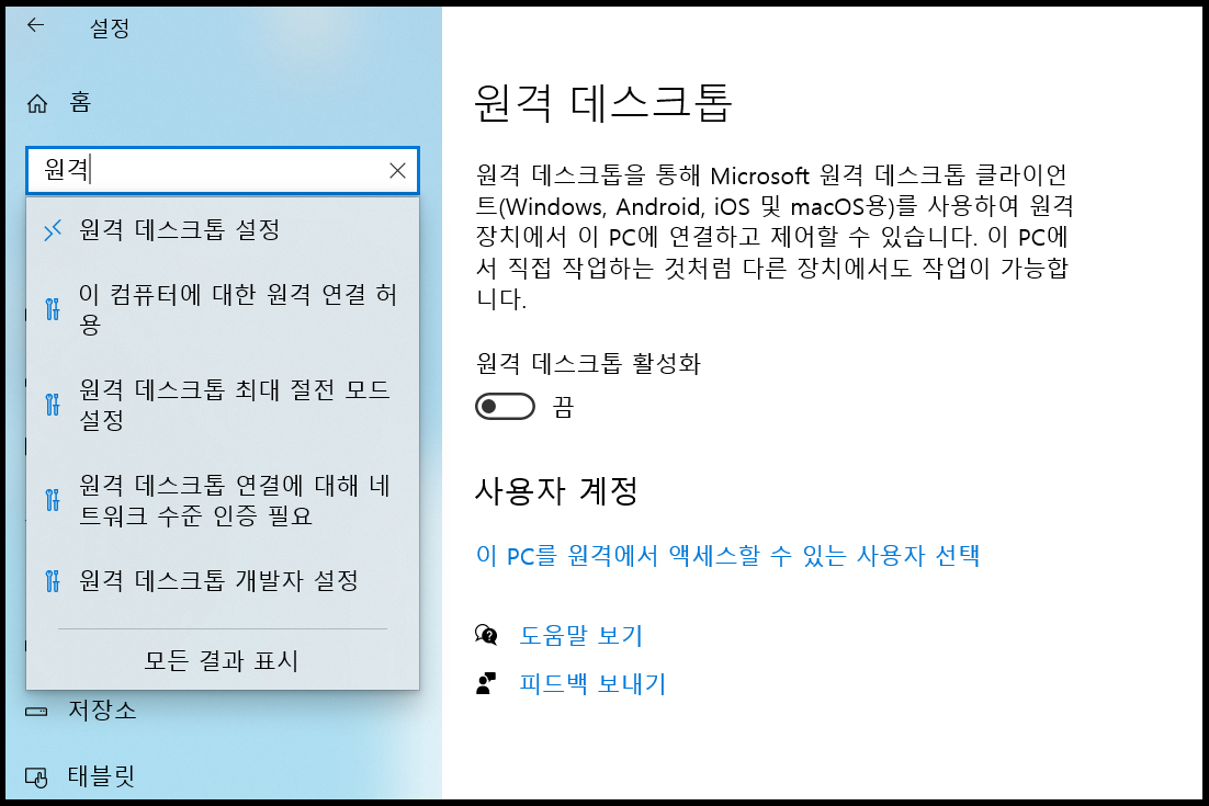 윈도우에서 시작 → 설정(톱니바퀴 아이콘)으로 들어가면 왼쪽 리스트 중 아래쪽에 <원격 데스크톱>이라는 앱이 보입니다. 이것을 클릭하면 위와 같은 화면이 뜹니다. <원격 데스크톱> 앱이 안 보이면, 아래와 같이 해봅니다.