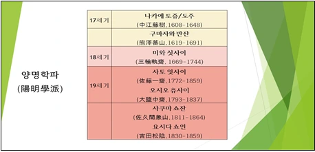 나카에 토쥬와 구마자와 반잔에 이어 중기에 활약한 미와 싯사이로 계승되었습니다. 이후 에도시대 말엽에 동쪽 에도(지금의 도쿄)에서는 사토 잇사이가 등장하여 활약하고, 서쪽 오사카에서는 오시오 츄사이(본명은 헤이하치로平八郎)가 나와서 활약하였습니다. 사쿠마 쇼잔은 사토 잇사이의 제자이며 요시다 쇼인의 스승이기도 합니다.