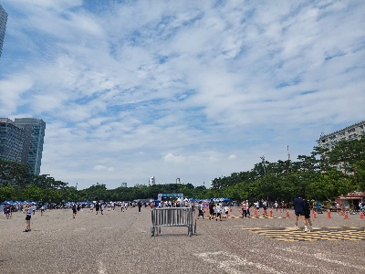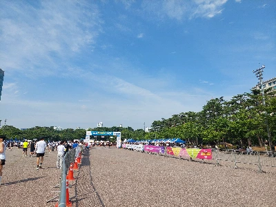 5호선 여의도 역에 내려서 문화마당 광장에 도착하니 8시가 되었습니다. 마라톤은 9시에 출발하니 시간 여유가 있습니다. 먼저 대회본부 쪽으로 가서 배번호와 기념품을 받습니다. 저는 원래 6월 22일에 열리는 람사르습지 밤섬런 마라톤대회를 신청했었습니다. 그런데 갑자기 대회가 취소가 되어 이 대회에 신청해, 집에서 배번호를 받지 못하고 현장에 나와 수령합니다. 탈의하는 곳을 찾아 옷을 갈아입고 물품 보관소로 가니 줄서서 기다리는 사람들이 수백 명은 됩니다. 짐을 맡기고 나니 벌써 8시 45분.