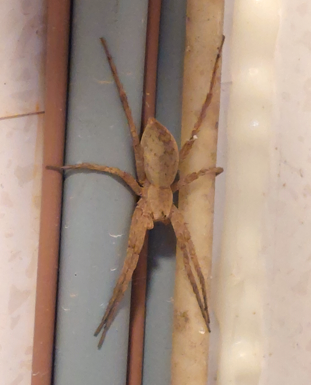 농발거미라고 합니다. 큰 것은 10cm가 넘으며 한국, 중국, 일본과 미국 등지에 산다고 합니다.(식물이나 동물, 곤충의 주요 서식지가 한중일 지역이라고 하면 우리나라 고유종일 가능성이 큽니다. 한반도 위치가 중국과 일본의 교집합적인 지역이기도 하지만 목소리 큰 외국 학자들이 한반도 고유종을 그렇게 설명하는 경우가 많기 때문입니다.) 거미집을 치지 않고 직접 돌아다니며 먹이 사냥을 하는 거미입니다. 이 농발거미는 동굴이나 집안 내부에 사는데 사람에게 피해를 주지 않고 독성은 거의 없다고 합니다. 특히 어두운 곳을 좋아하고 바퀴벌레의 천적이며 동작이 아주 빠르고 잘 뛰어다닌다고 합니다. 수명은 3년 정도이며 해충을 잡아먹는 중요 천적입니다.(<위키백과>) 하마터면 이 좋은 익충 거미를 죽일 뻔했습니다.
