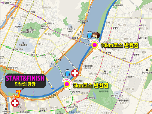 오늘 코스는 잠실 청소년광장을 출발하여 잠실대교(2km 지점), 잠실철교(2.5km 지점. 5km 주자 반환점), 올림픽대교(3.5km 지점)를 거쳐 천호대교(5km 지점)에서 되돌아옵니다.