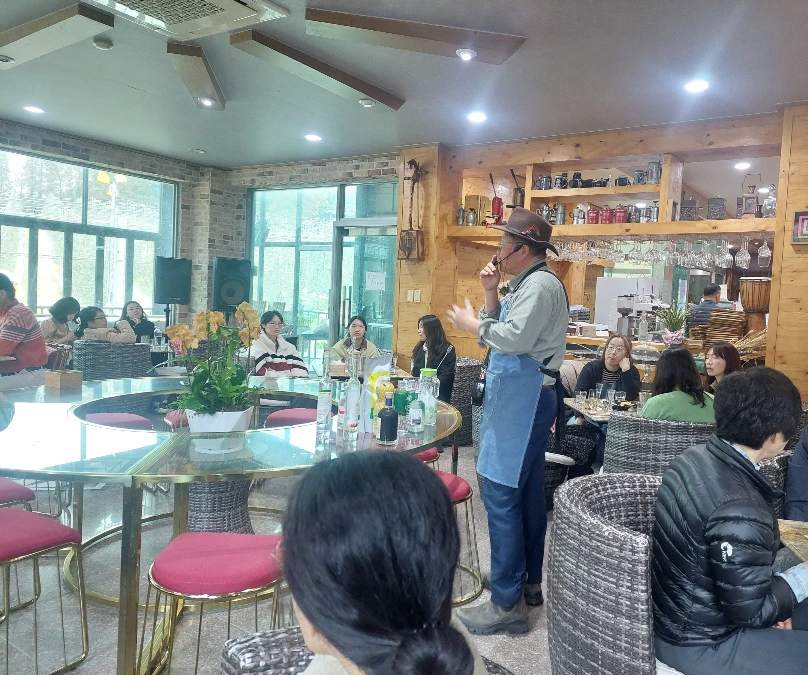 장 대표는 최근에 프랑스 와이너리를 돌아다니며 <사토 마고>를 양조한 중고 오크통을 구했다고 합니다. 사과 와인 증류주를 그곳에 보관하여 특별한 맛과 향을 우려내기 위한 것이었습니다. 그렇게 해서 구하기 어려운 오크통을 5개나 구입을 했다고 하는데 가격이 한 개에 3천만 원이랍니다. 5개면 1억 5천만 원입니다. 이런 오크통이 저장 창고에 아마도 수백 개는 넘게 보관되어 있었습니다. 그 안에는 또 비싼 술이 가득 들어 있을 것이니 규모가 어마어마합니다. 현재 직원은 11명이고 연매출이 30억 정도이며 대만, 홍콩, 베트남, 호주 시장에도 이곳에서 생산된 술이 판매되고 있다고 하니, 알면 알수록 대단한 회사입니다.(이민선, 빚·투자 없이 사업하는데 30억 매출, 비결은?, <오마이뉴스>, 2025.4.26.)