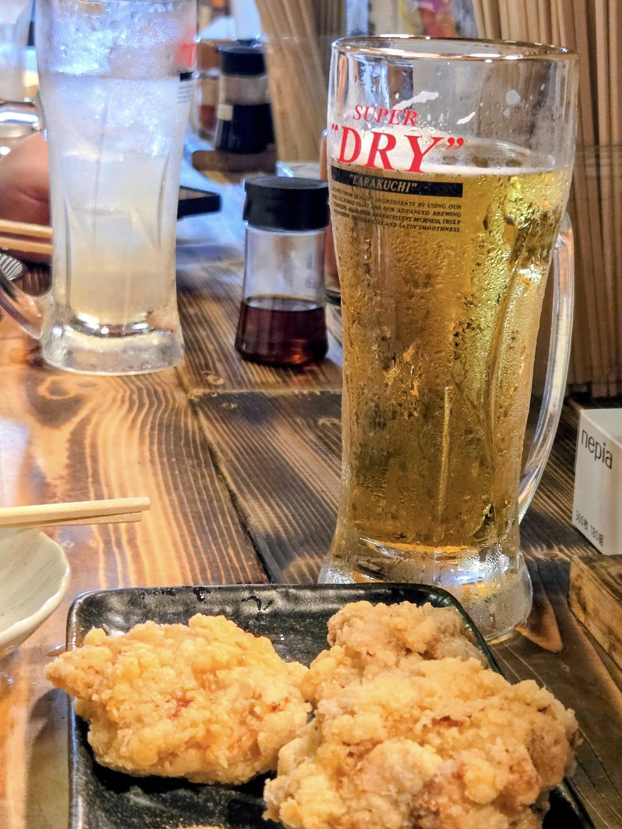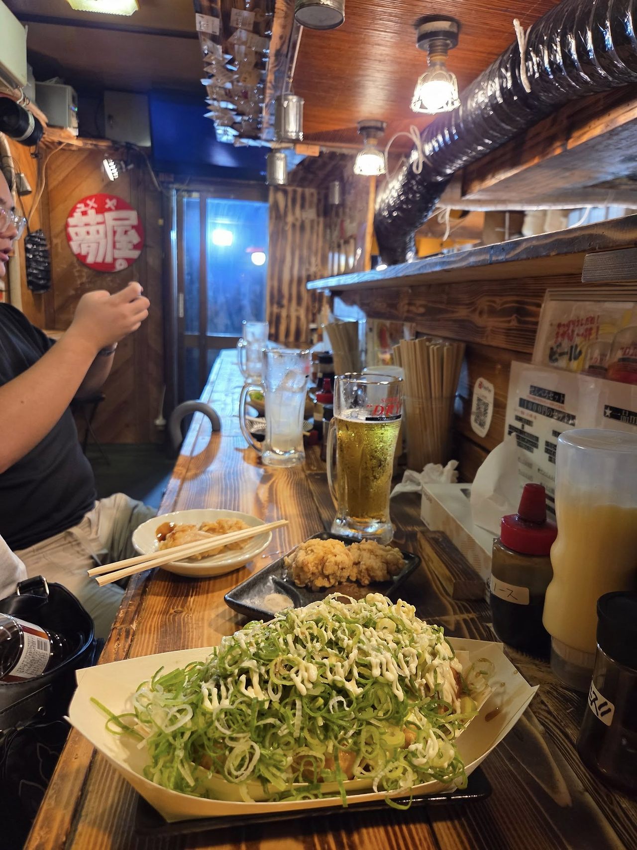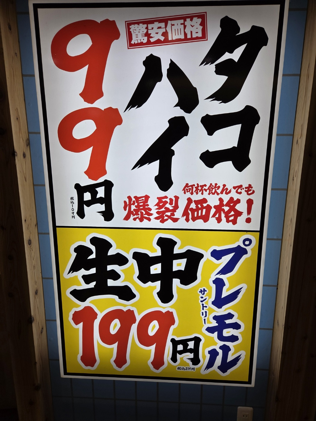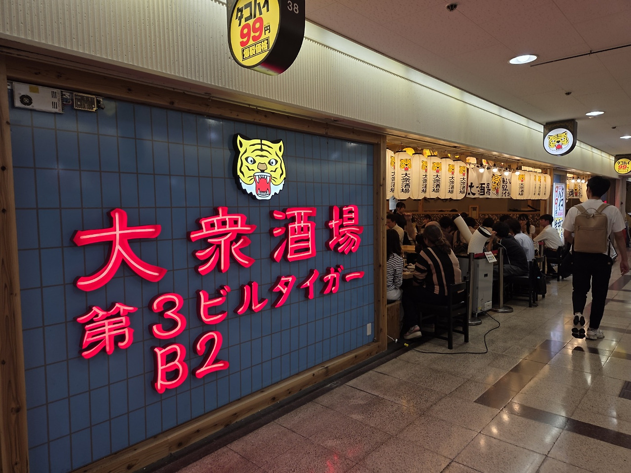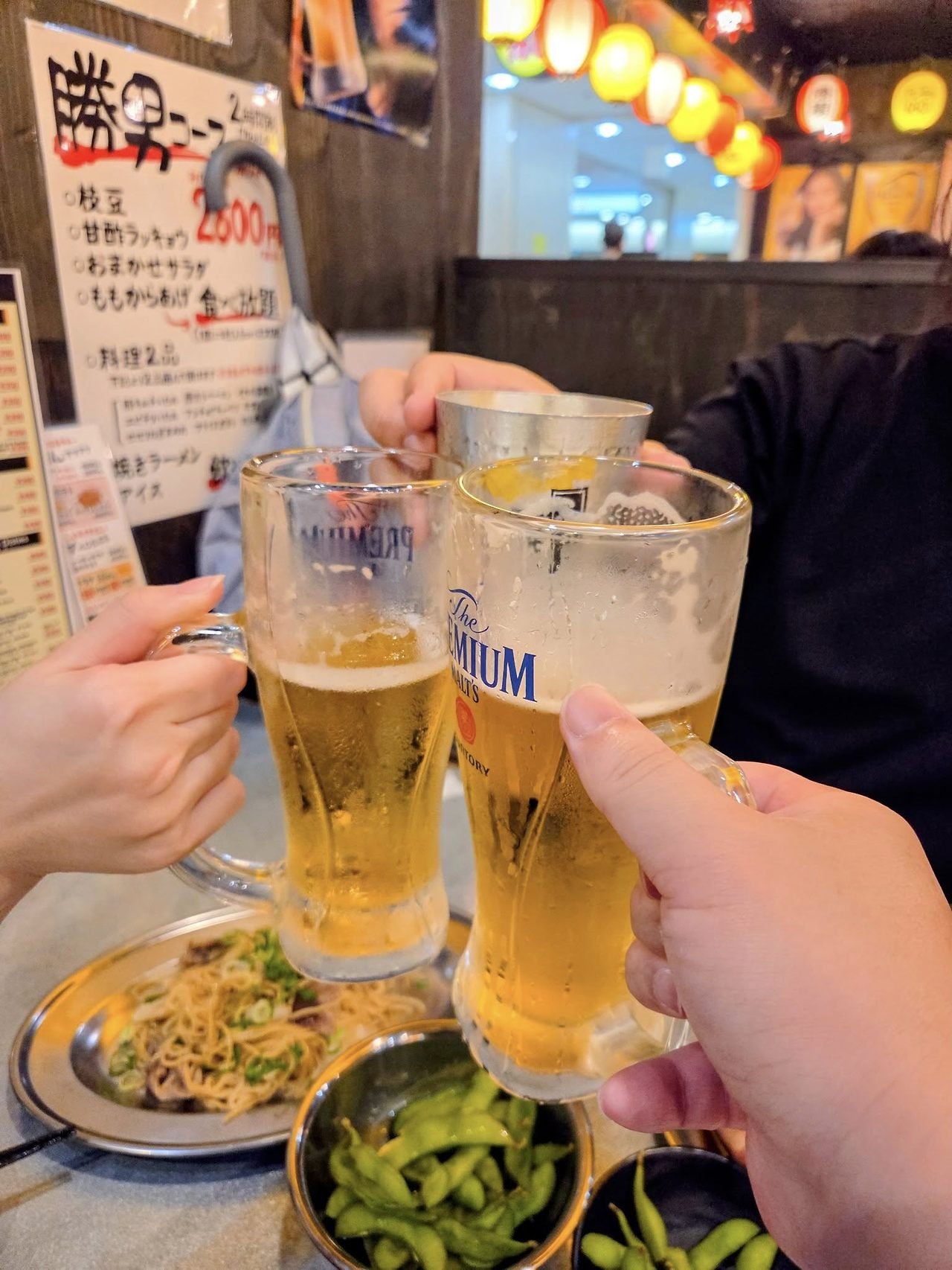 우리는 당당하게 기차 패널을 들고 술집으로 갔다. 우메다에키마에 빌딩의 지하 식당들은 저렴한 가격으로 유명하여 오사카 직장인들의 많은 사랑을 받고 있다. 하이볼은 99엔이고 생맥주는 199엔이다. 심지어 산토리 프리미엄 몰츠가 199엔이다. 사랑하지 않을 수 없는 가게이다. 한국과 달리 일본에 하이볼이 대체로 저렴한 편이며 가난한 사람들이 취하기 위해 하이볼을 마시는 경우도 있다. 특히나 스트롱 제로같은 츄하이는 사회문제가 될 정도로 저렴하지만 독하다.