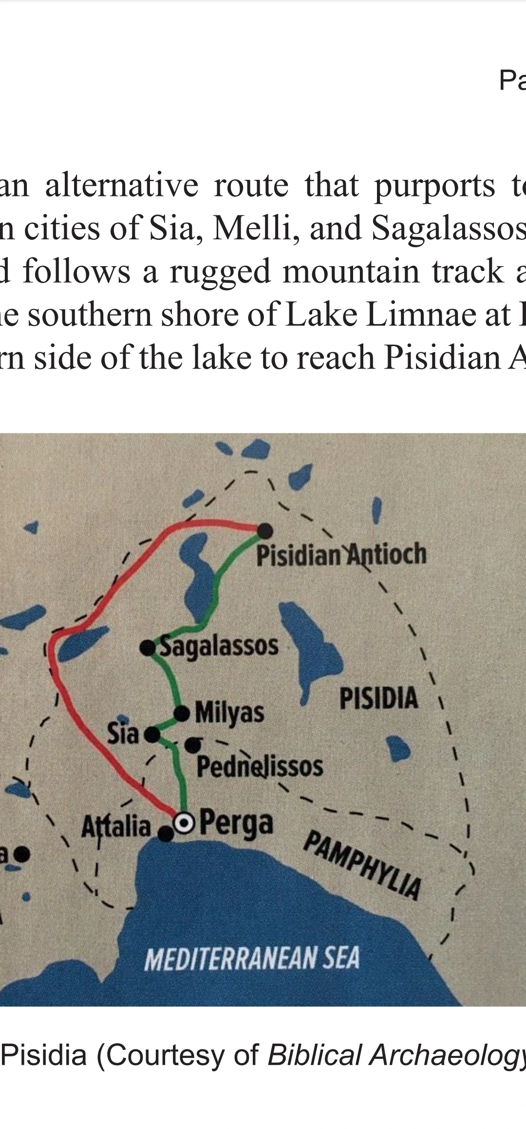 학자들은 주장하기를 아마도 바울은 버가에서 비시디아 안디옥으로 올라갈때는 로마가 군사도로로 만든 세바스티에 길을 따라 올라갔지만 다시 수리아 안디옥에서 앗딸리아로 돌아올 때는 이 짧은 길을 이용하지 않았을까 생각한다.