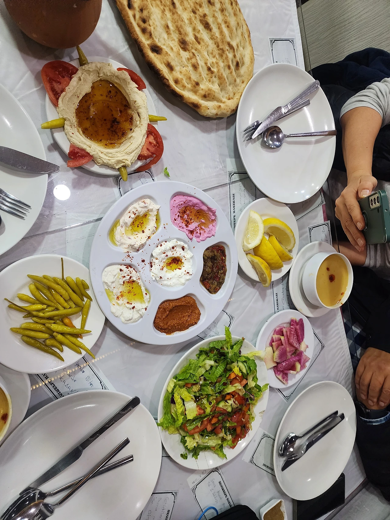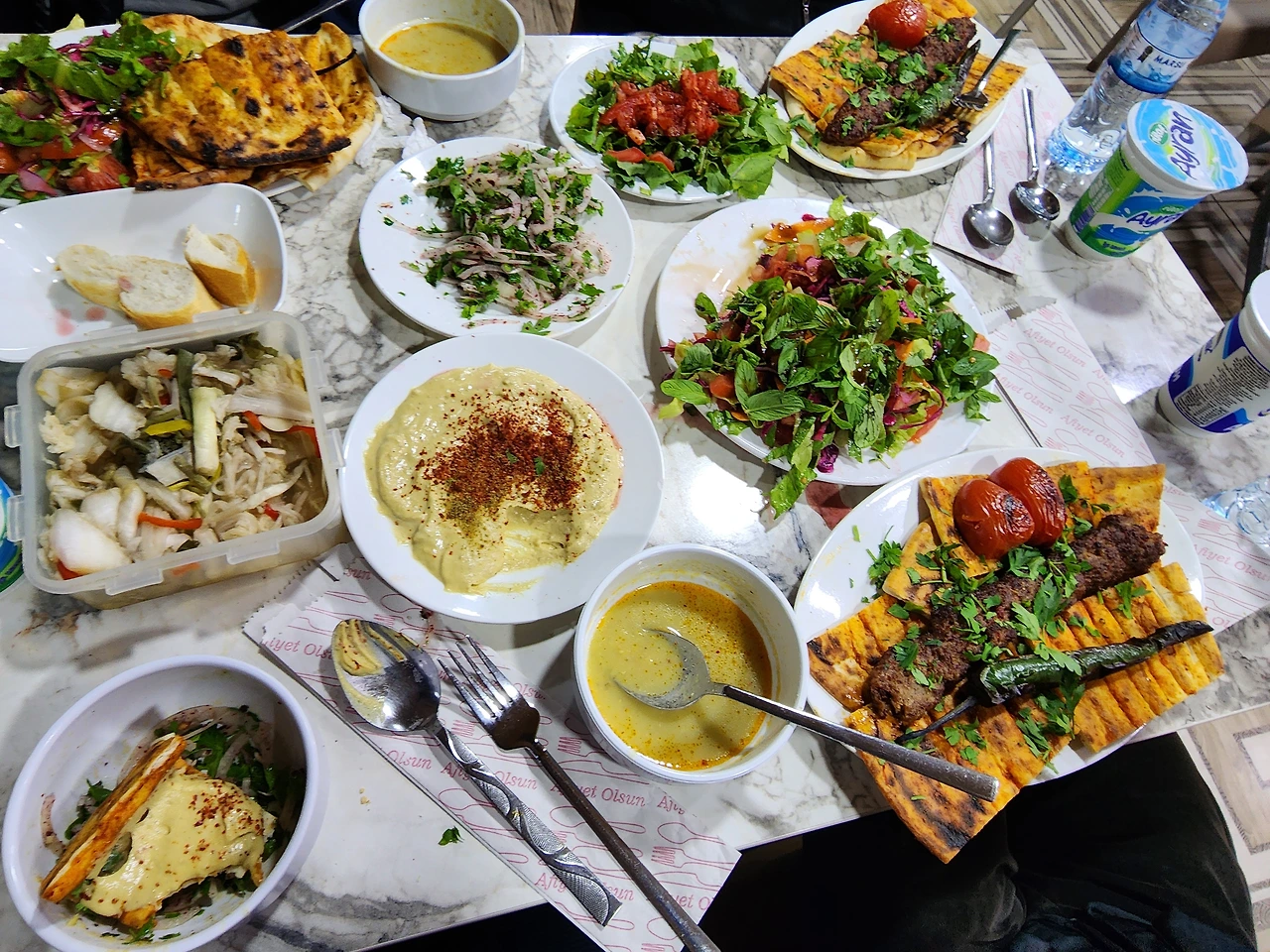 늦은 시간 수리아 안디옥으로 가는 길에 지난 여정에 들렀던 식당을 다시 들렀다. 정말 경치 좋은 곳에맛도 좋고 플레이팅도 일품이었던 진귀한 음식과 불이 붙은 터키 커피가 기억에 남아서다. 7시가 넘은 시간이라 이미 많은 사람들이 식사를 마친 시간이었다 . 그래서인지 라마단 이프타르 시간에도 우리가 먹을 식탁이 남아있다. 특별히 라마단기간이라 예약없이는 왠만해서는 식당에서 먹을수 없을 정도로 붐빈다. 다른집은 주차할곳도 없이 붐비는데 정말 자행이었다.