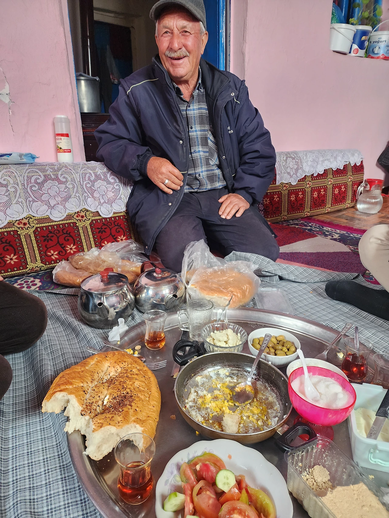 마침 할머니가 방바닥을 슬고 계신다. 집은 분홍색 붉은색등 알록달록한 카페트와 쇼파로 아주 깔끔하다. 할머니의 바지런함이 느껴진다. 차 한잔을 마실까해서 들어갔는데 집 닭이 낳은 계란 후라이와 각종 집에서 만든 치즈 빵을 가져와 한상을 차려주신다. 라마단이라 본인들은 드시지 않으시면서 우리가 먹는걸 구경만 하신다. 여정중 먹었던 음식중 평생 잊을수 없을 식사였다.