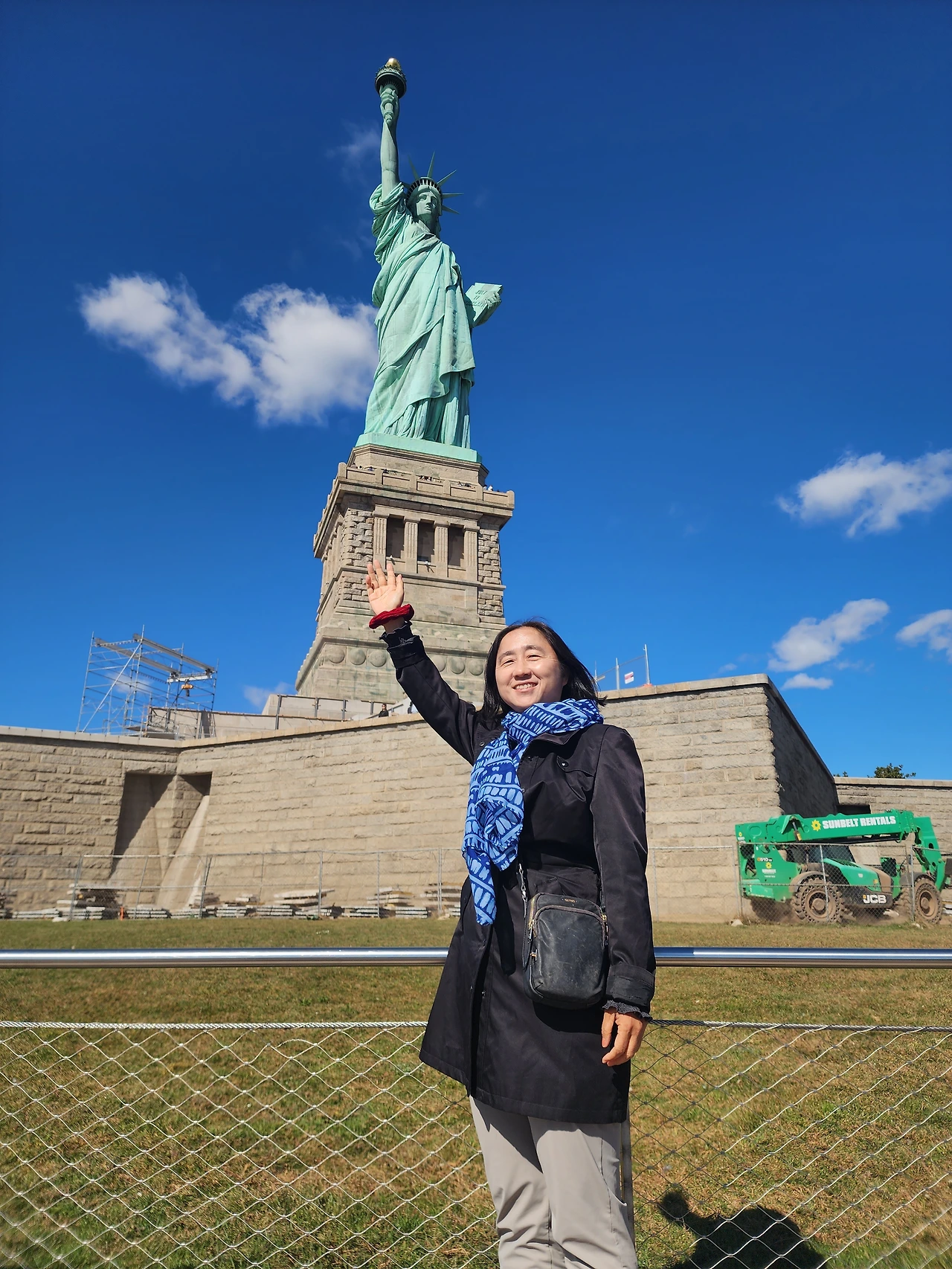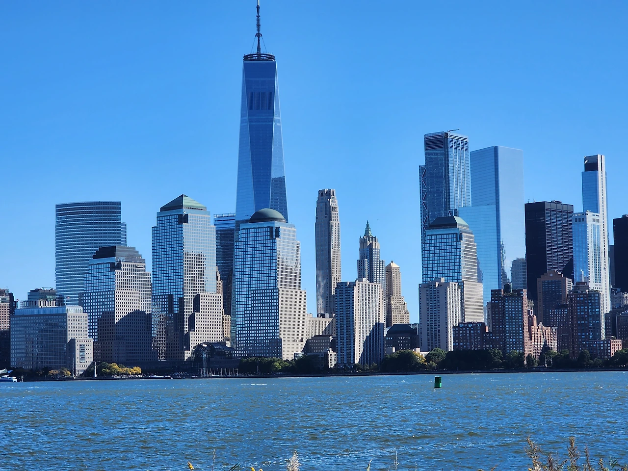 드디어 배가 들어오고 많은 인원이 배에 탑승했다. 우리는 배 꼭대기 층으로 올라갔다.여기가 갑판인가? 긴 의자들이 여럿 놓여있었고 이미 많은 사람들이 자리를 차지하고 있다. 몇몇은 미국 국기 앞에서 사진을 찍기도한다. 바로 건너편이 뉴욕이라 그 빌딩숲을 배경으로 찍고 있는 것이다. 두바이가 연상되었다. 두바이 빌딩들이 이곳을 모방한듯하다. 아 저 빌딩 숲이 전세계를 흔드는 경제 금융의 숲인가? 그에 비하면 이 건너 편은 얼마나 평화롭고 조용한가? 늘 영화로만 보던 광경이라 그런지 더 실감이 나지 않고 인공같기도하고 저 빌딩이 네모상자 장난감같기도 영화 셋팅같기도했다. 하지만 정말 아름다운 광경이다. 멀리 자유의 여신상이 보인다. 미국의 상징 전세계인의 상징을 드디어 보게되는 것이다.