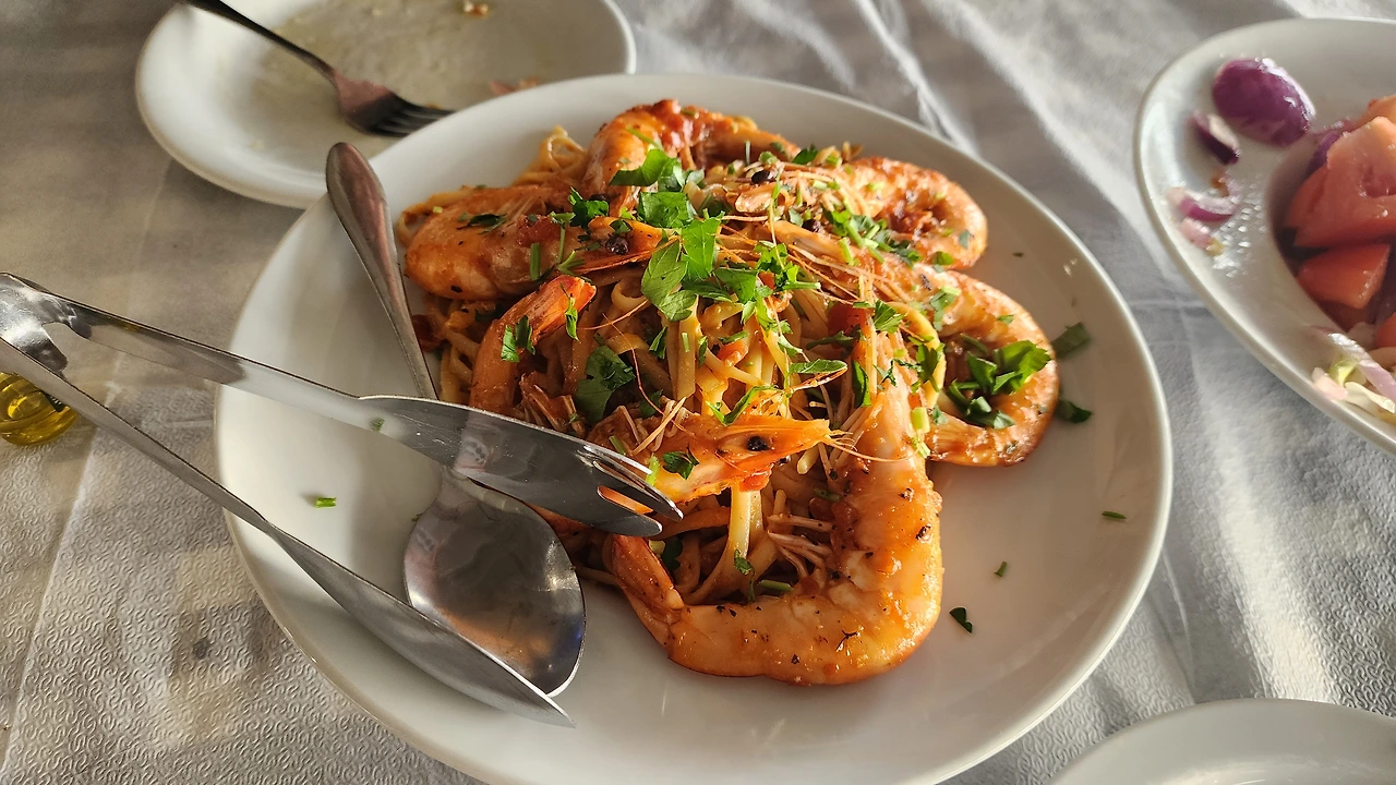 첫 도착 후 먹은 음식 세우 스파게티와 수불락 . 20유로 밖에 안한다