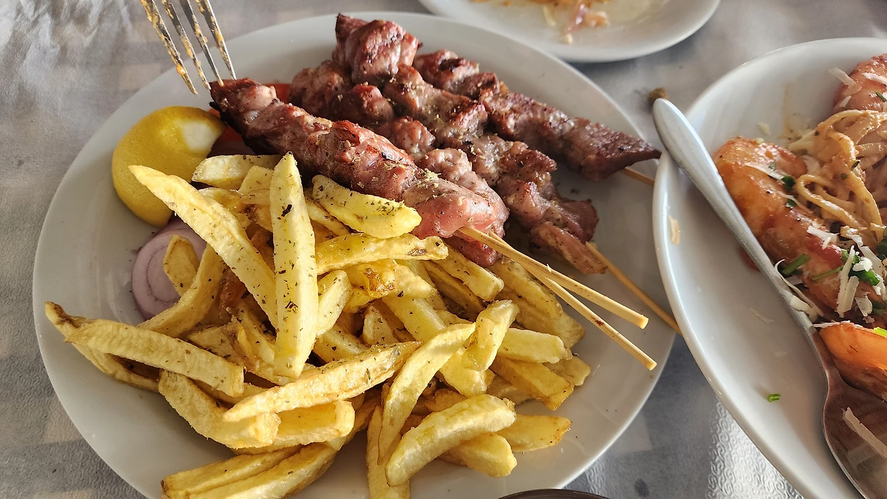 렌트카를 빌렸다. 7일에 48유로 비수기라 그런지 너무 싸다. 아침도 제대로 먹지 못하고 온터라 까발라에 도착하자마자 식당으로 향했다. 차를 식당 앞에 파킹하고 차를 기억하기 위해 사진을 찍었다. 이제 우리와 일주일을 같이 지낼 차이다. 근처 식당은 지나다가 냄새가 우리를 유혹하는 곳으로 정했다. 무조건 해물 스파게티와 그리스의 돼지고기 쑤불라키와 그릭 샐러드를 시켰다. 정확히 20불 나왔다. 오늘 아침 벤구리온 공항에서 먹은 커피와 빵조가리 하나가 만원이었는데 정말 그리스 물가 싸다. 대만족이었다.