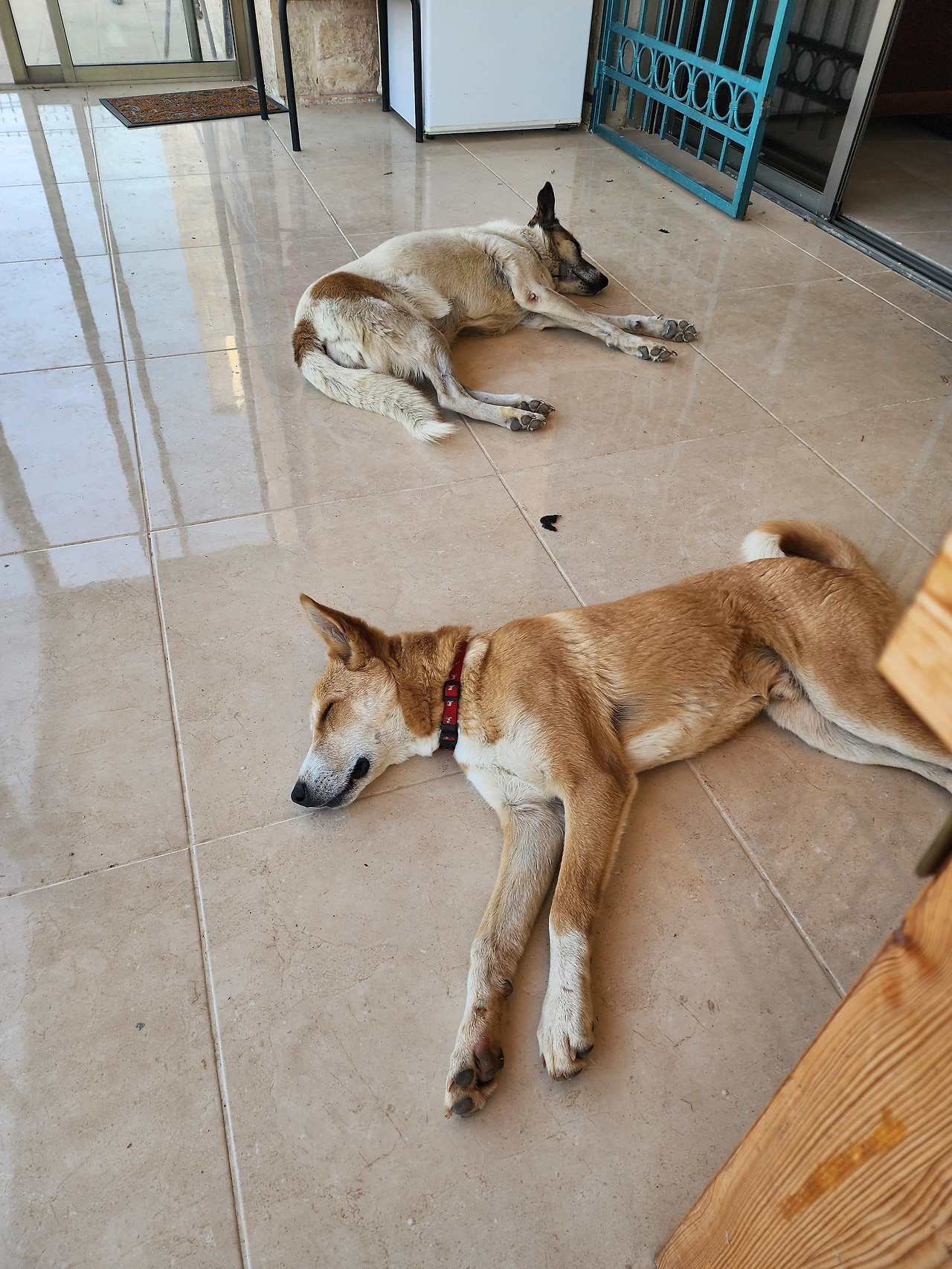산책을 하고 집에 돌아온 후 뻗은 오순이와 살구 .