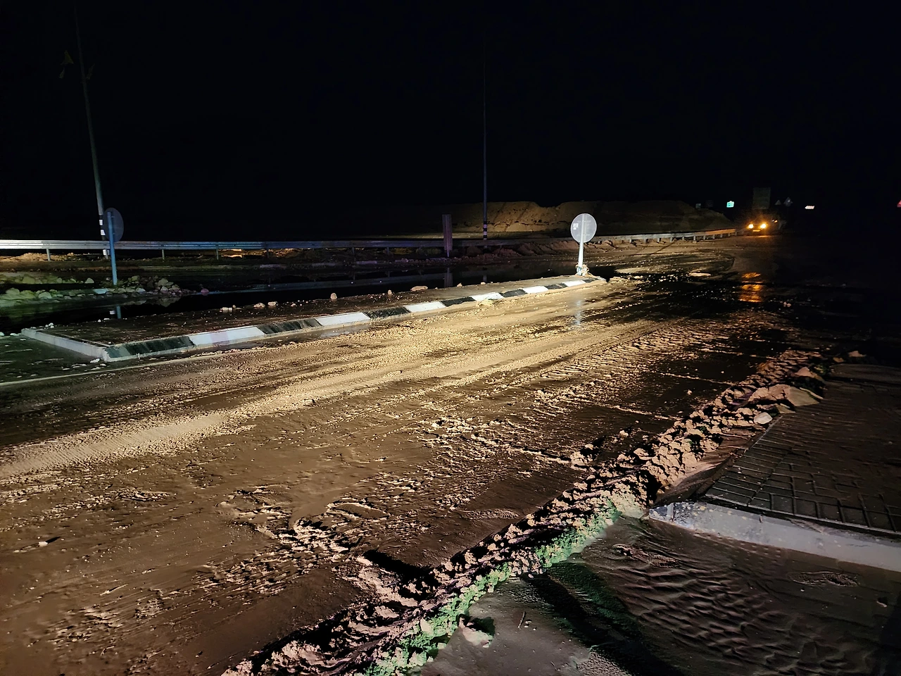 우리는 그곳에서 라면을 끓여먹었다. 저녁을 먹을만한 것도 없었고 일단 에일랏에 가서 먹으려는 의도였지만 이제 돌아들어갈 곳도 없어 마지막 휴게소에서 라면 4개와 가져온 찬밥을 섞어 최후의 만찬을 즐기고 다시 도로가 뚫리기만을 기다렸다. 혼선 가운데 우리의 촉으로 경찰이 철수하면 우리도 그길을 열어나가며 돌진했다. 하지만 마지막 마지노선이었는지 40번 도로와의 접점에서는 토사가 너무 심해 치우는걸 구경하고 있어야했다. 한 유대인이 우리에게 다가와서는 7시긴 이상 걸릴거라며 근처 케툴라에서 하룻밤 자러가는데 같이 가겠냐며 우리에게 권유한다. 조금 가다가도 길이 열리지 않아 케툴라 민막집에 전화하여 방이 있음을 알고 함께 가보았다.가격은 4명이 50만원이다. 에일랏 호텔을 포기하고까지 자기엔 적지 않은 돈이라 조금 망설이다가 다시 차에서 자는 한이 있어도 에일랏으로 가자는 의견이 나왔다. 이제 무한정 기다리는수밖에 없다. 치우는 경찰과 직원들도 자야할거 아닌가? 곧 뚫리겠지 .. 그렇게 차에서 2시간 이상 잤을까? 비몽사몽간에 도로가 열리고 다시 운전대를 잡아 호텔에 도착하니 새벽 1시가 넘었다.